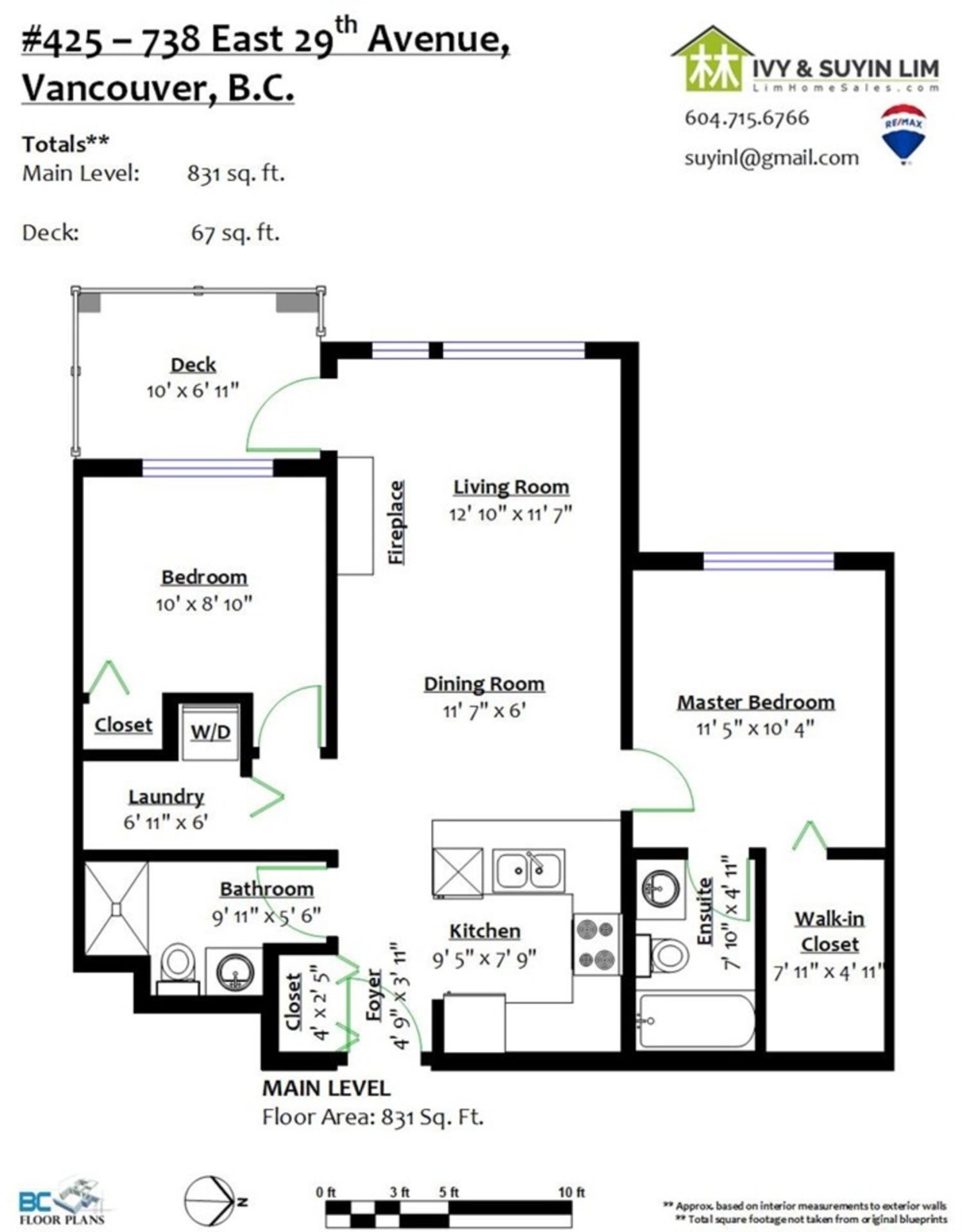 Welcome to Ledingham McAllister's Century! Conveniently located in the vibrant Fraser corridor. This TOP Floor, "Penthouse" 2 bdrm & 2 bath was the original show home tucked away on E 29th. Enjoy 10 ft Ceilings thru-out this airy, bright & quiet 831 sq ft unit. Facing the courtyard, you have garden views from the large balcony off the living room. Kitchen features, granite counters, plenty of cabinetry for storage, & stainless steel appliances. The master bdrm has a spacious walk-in closet & full master ensuite bath. Bonus! Full sized washer/dryer & extra insuite storage. 2 side by side parking stalls right by the elevator & storage locker included. Club Amenities include: Party Room & patio for BBQ's. Centrally located w/Starbucks, Shoppers Drug Mart, No Frills right downstairs!