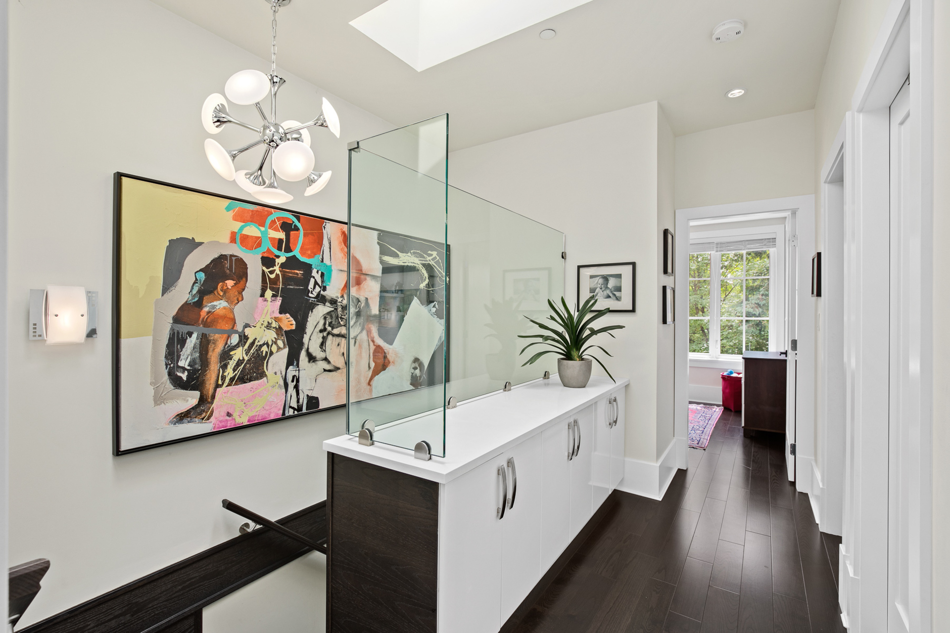 - Custom built in storage at the top of the stairs with a glass enclosure surround