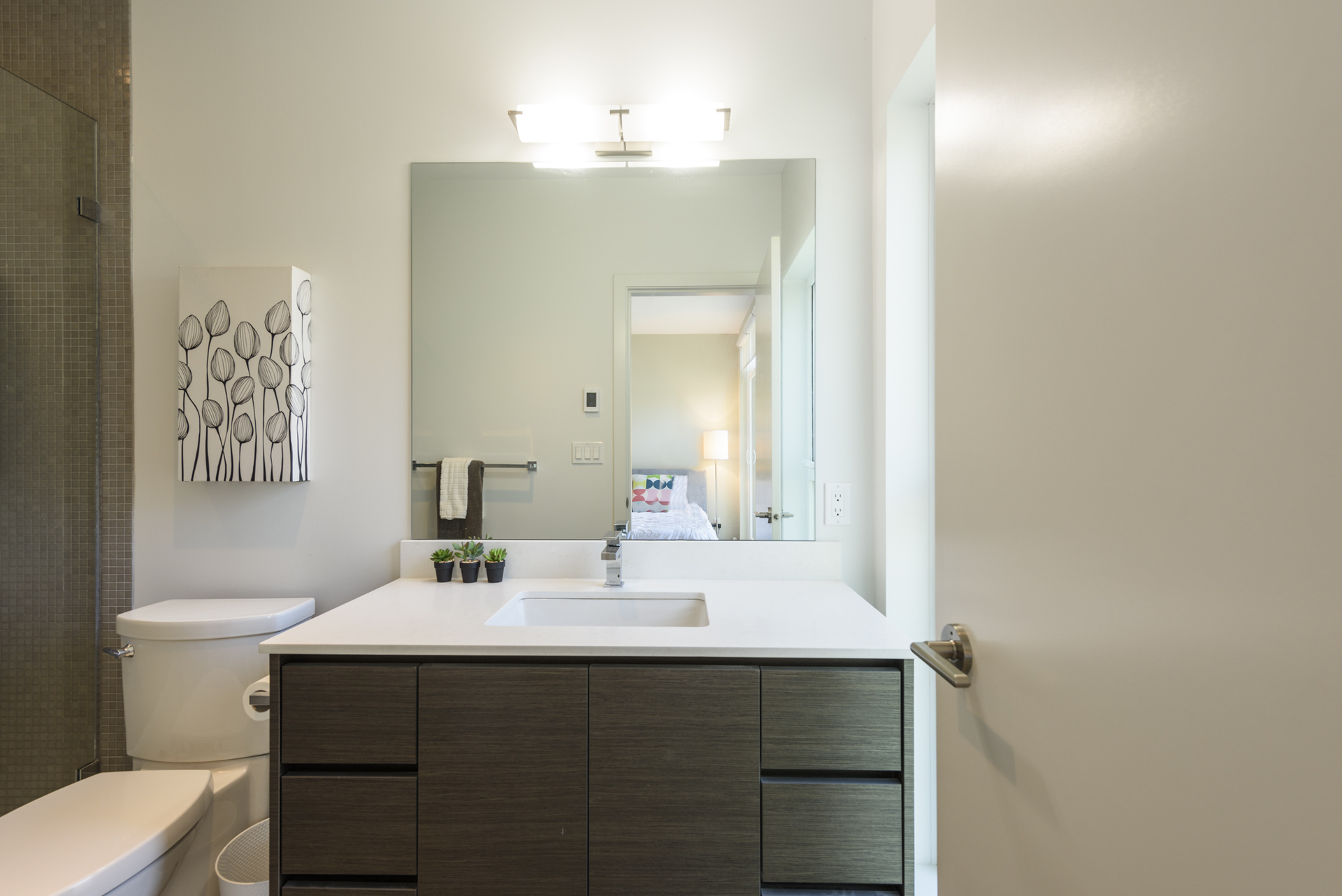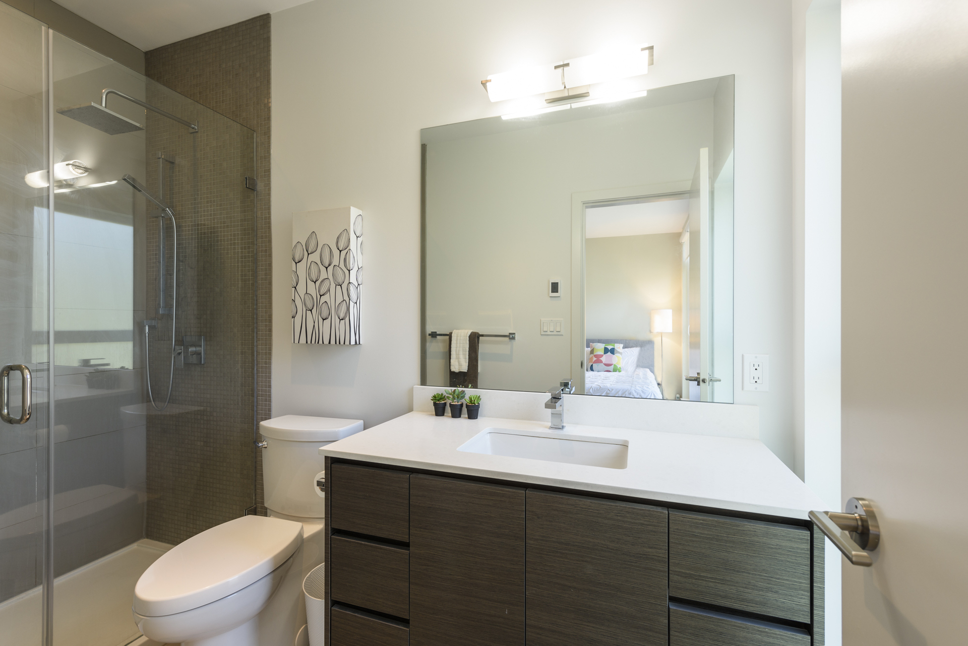 - Lovely 2 piece powder room with floating “square bowl” mounted sink