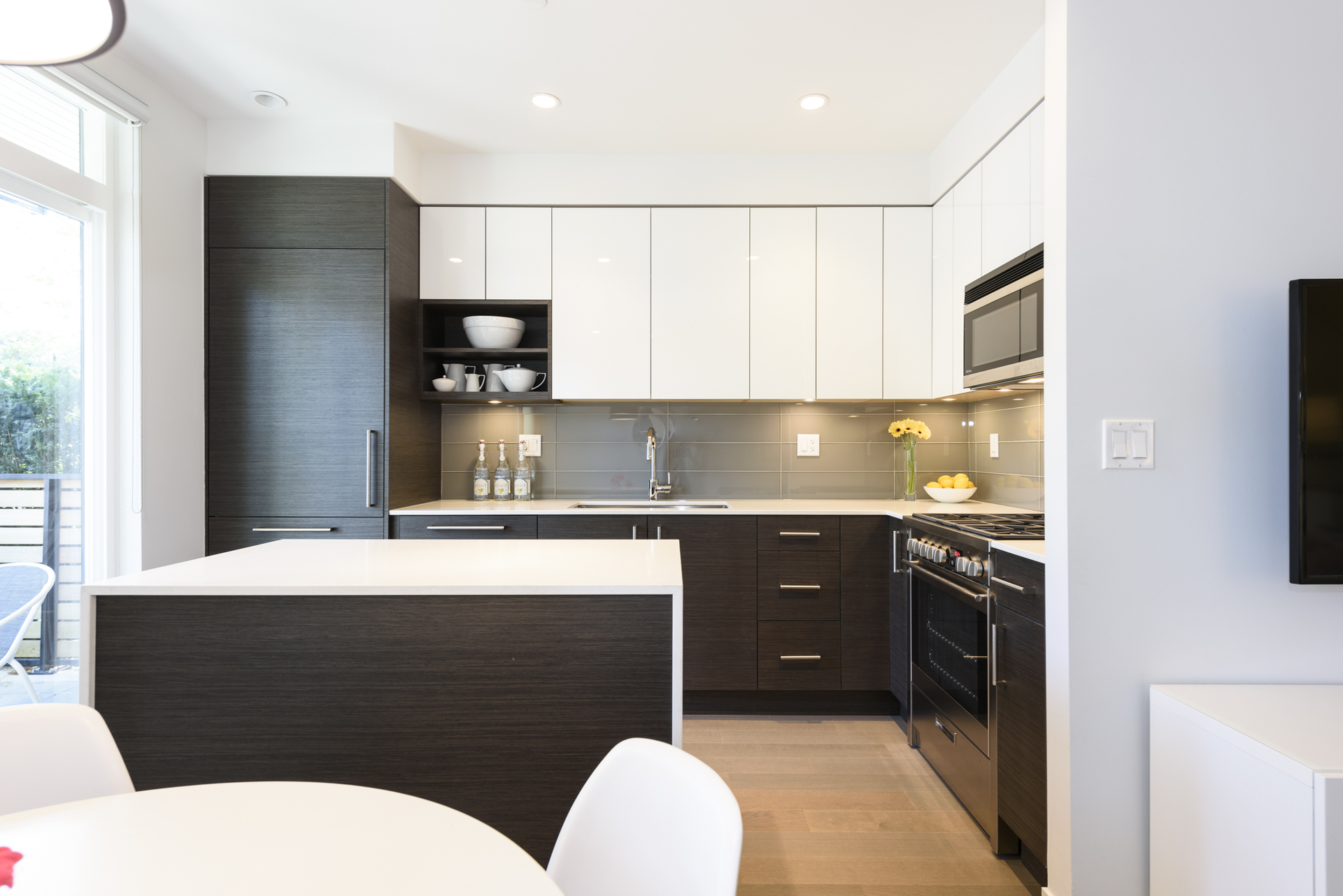 - Clean line flat cabinetry with white gloss uppers and Wenge wood lower cabinets