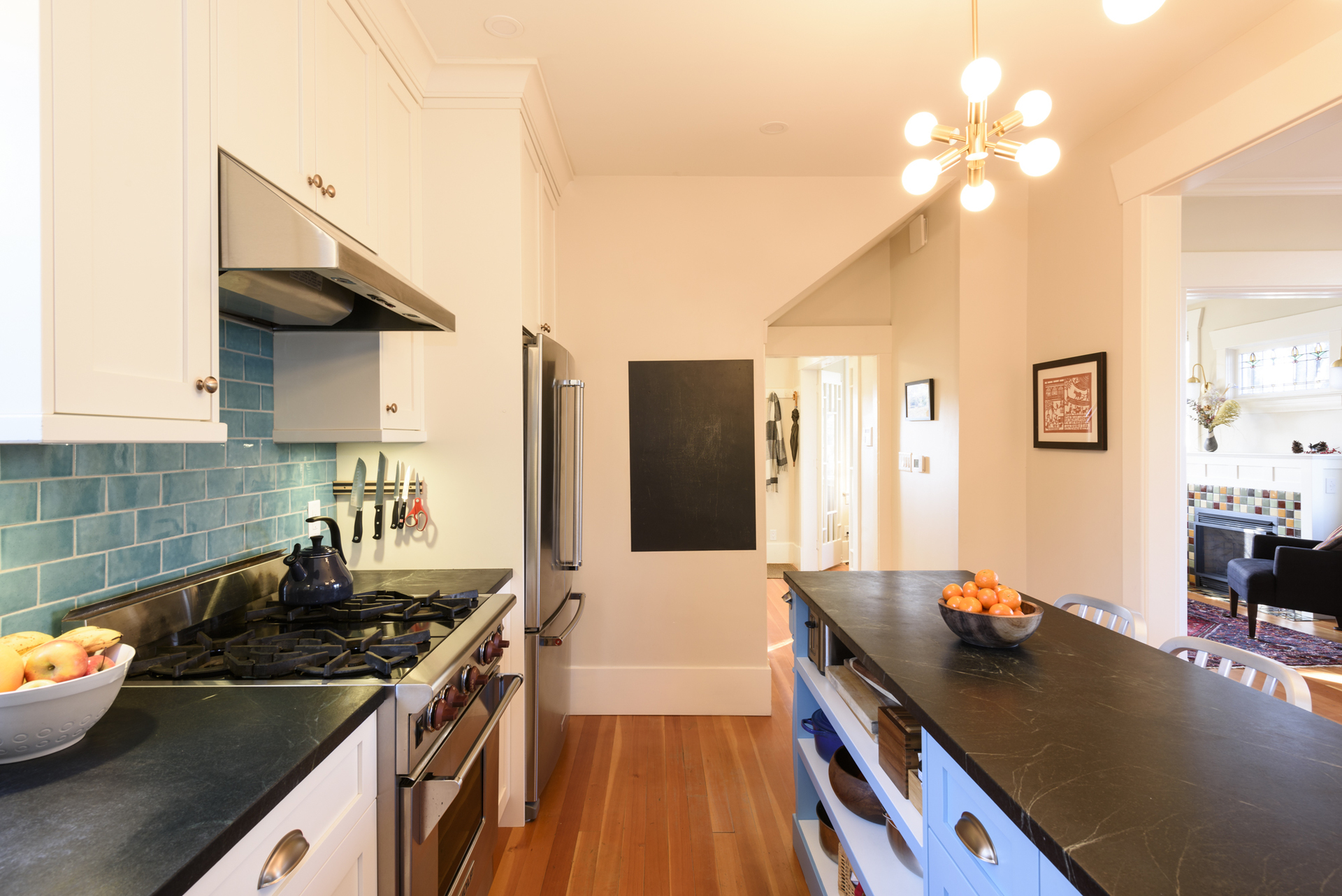 - Handcrafted Linen Luis subways tile back splash in vibrant Verde Mar
