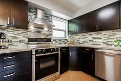 - Flat panel espresso cabinetry with soft close doors and drawers