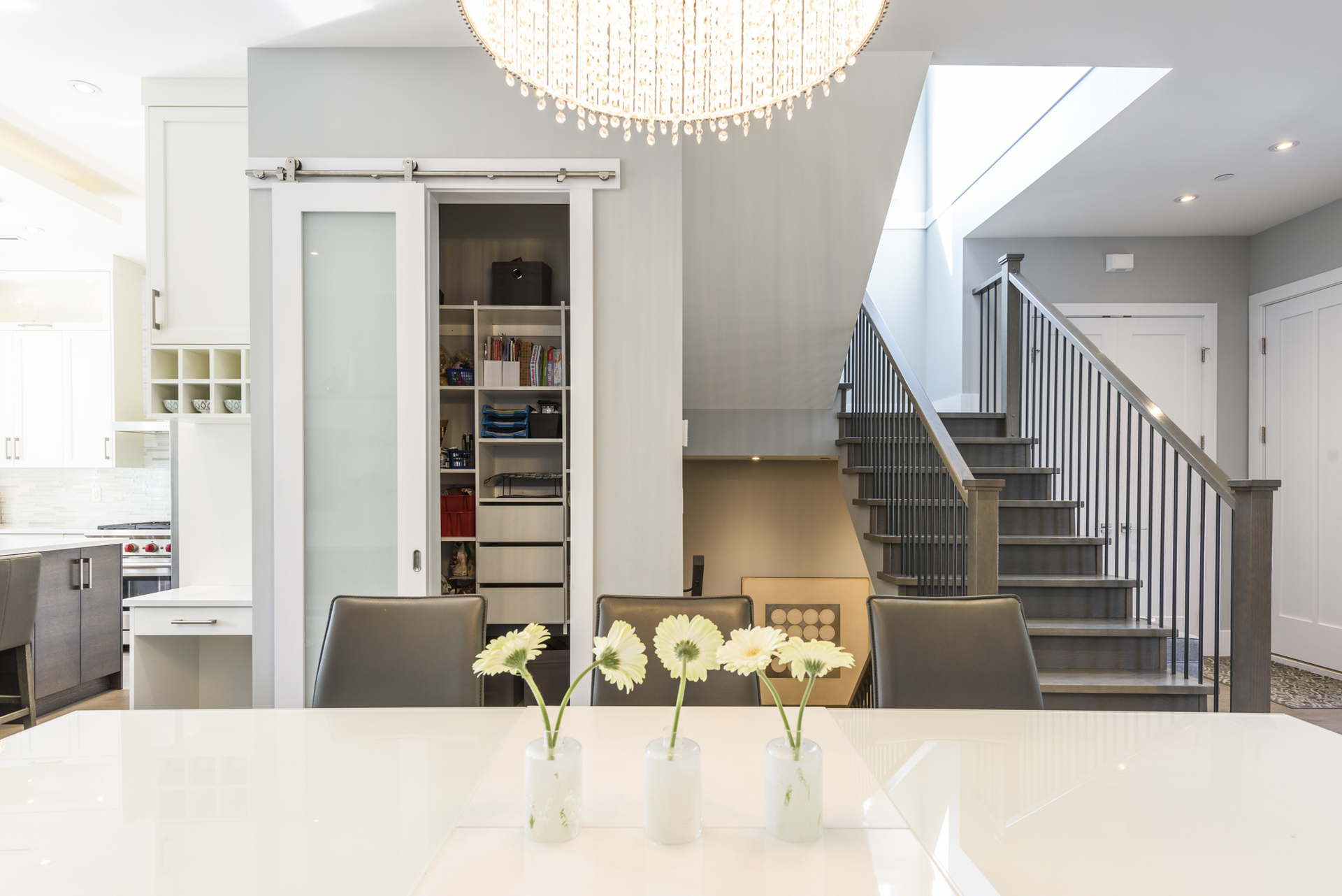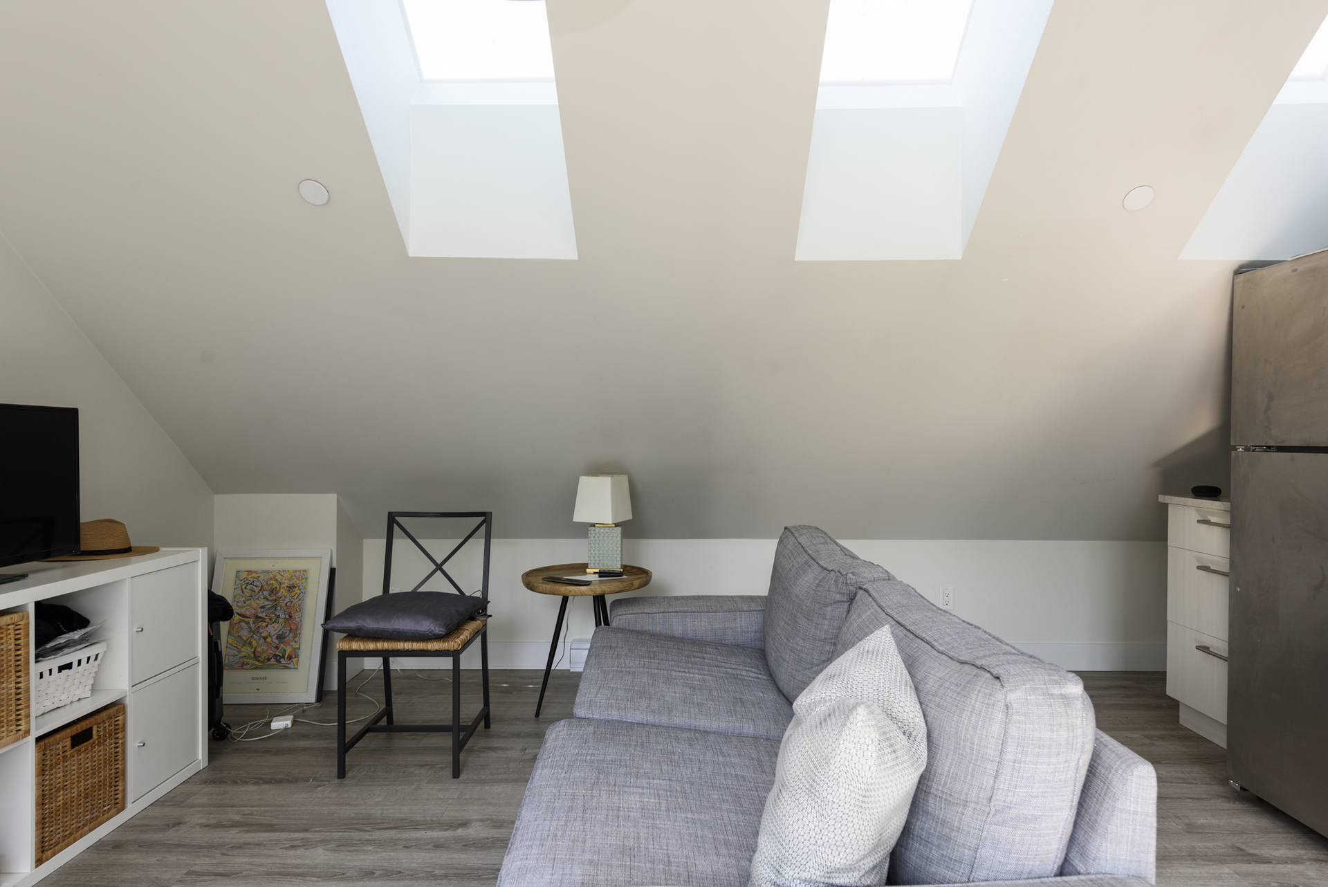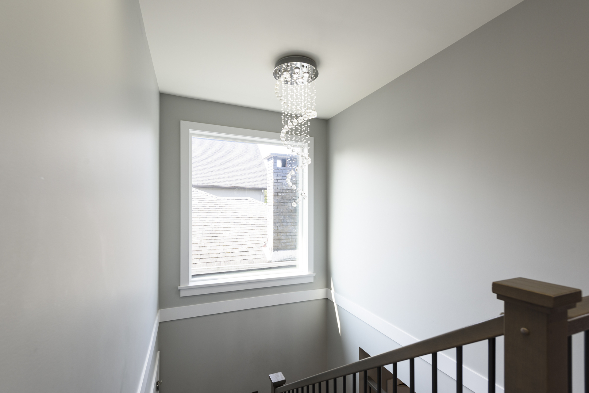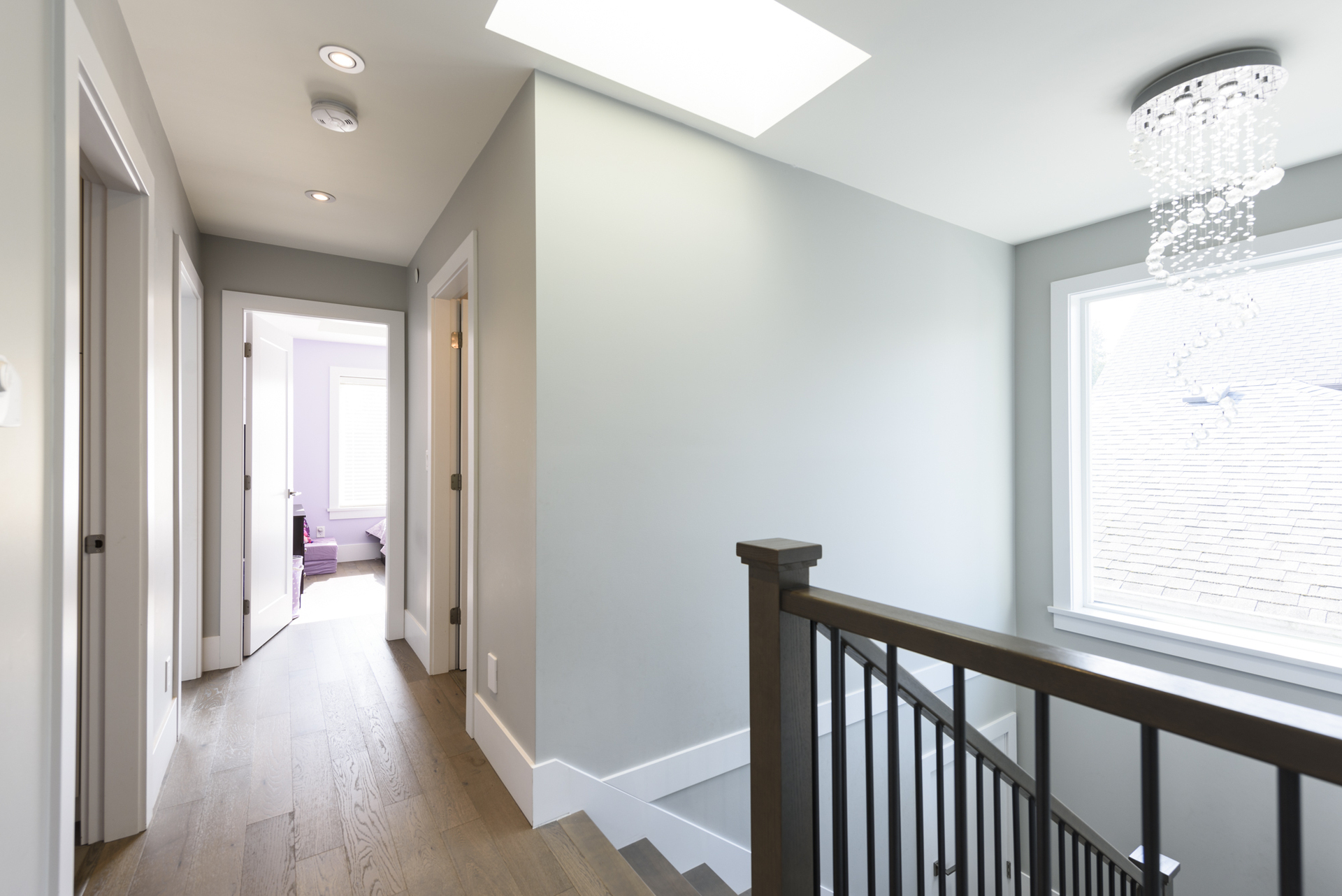 - Large skylight in the upper staircase