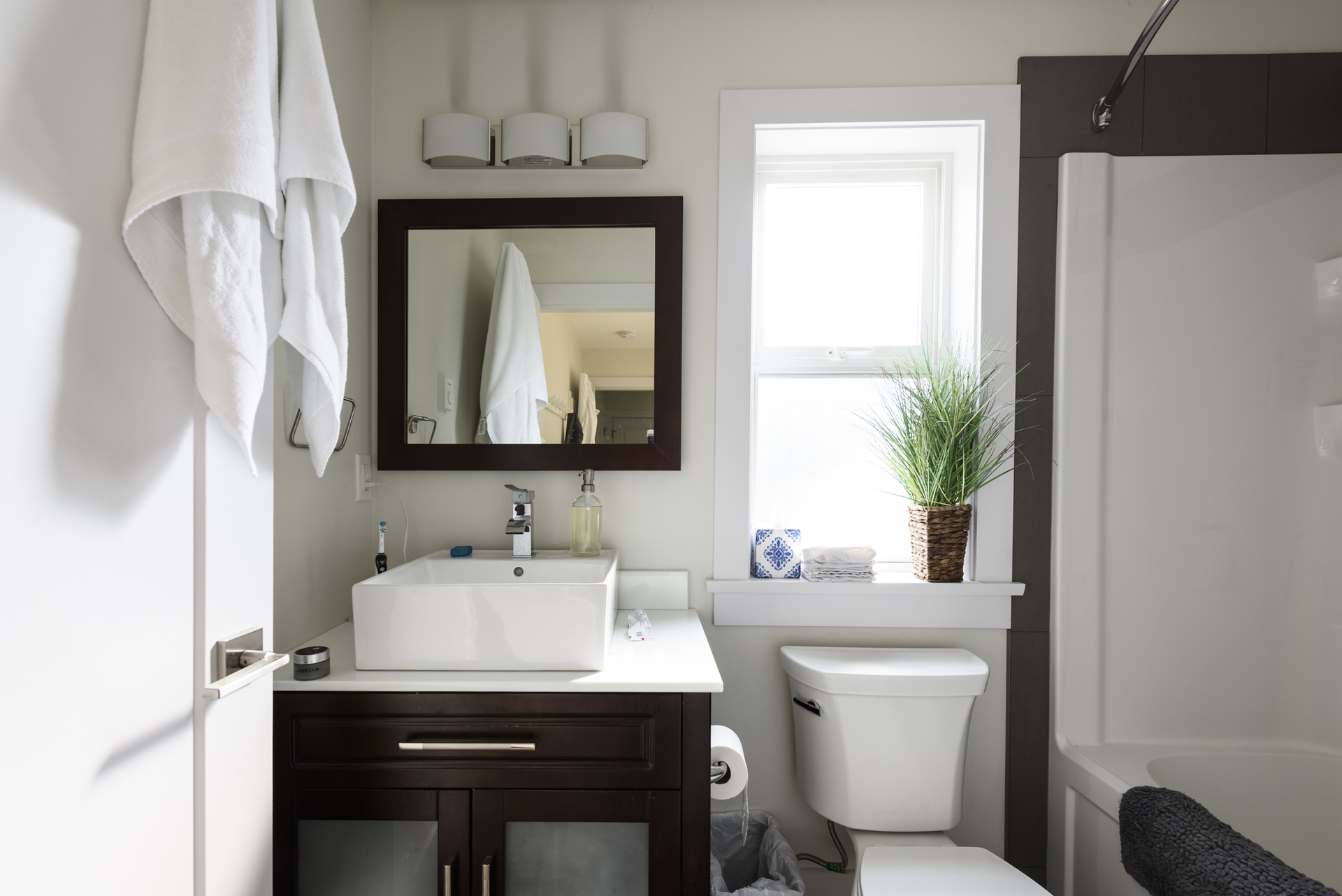 - Full bath with stand alone white vanity and tub/shower combo