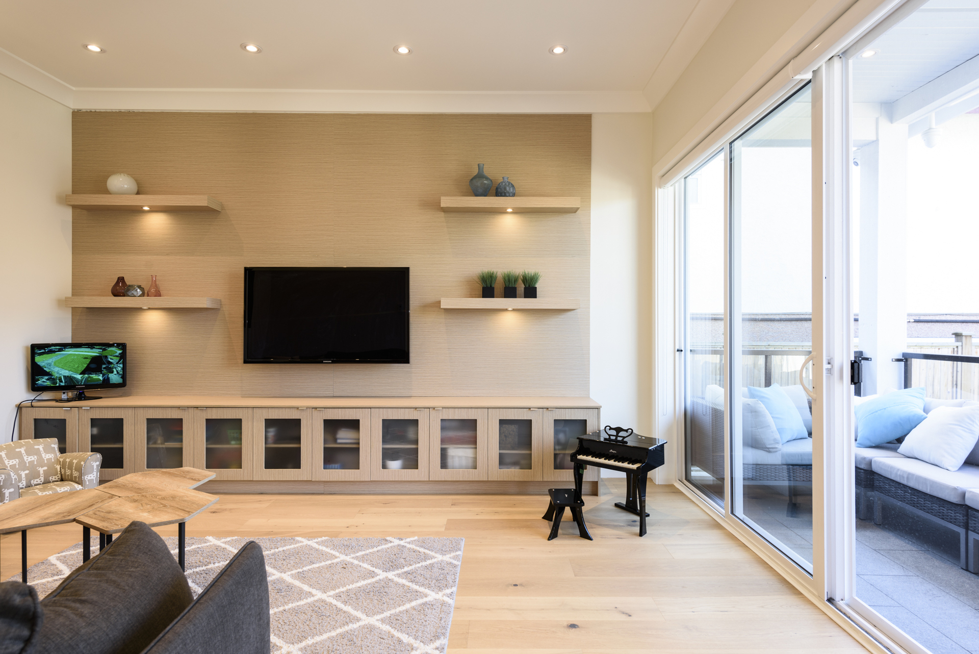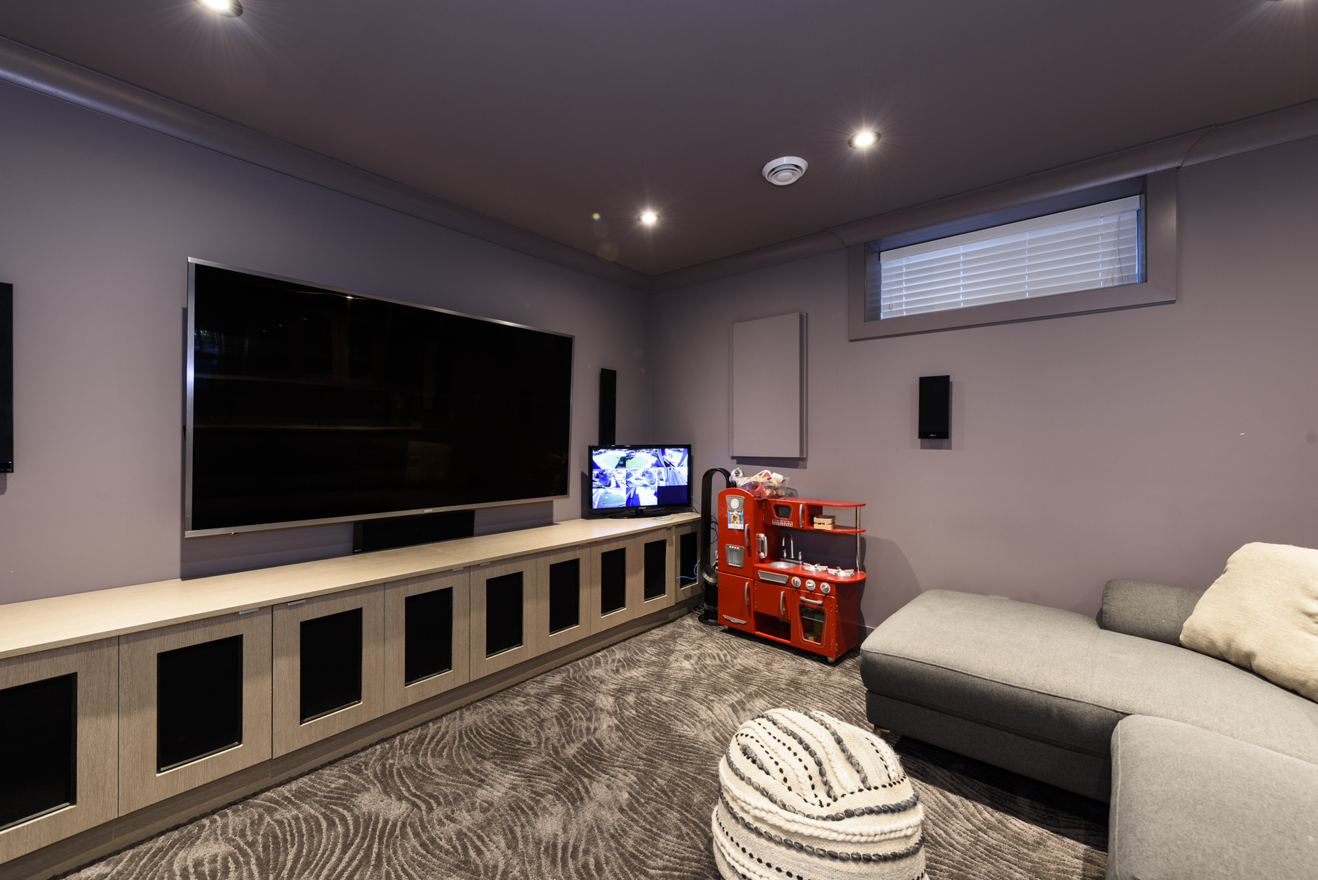 - Family room is large with wall to wall custom storage and wall to wall windows and doors to back deck