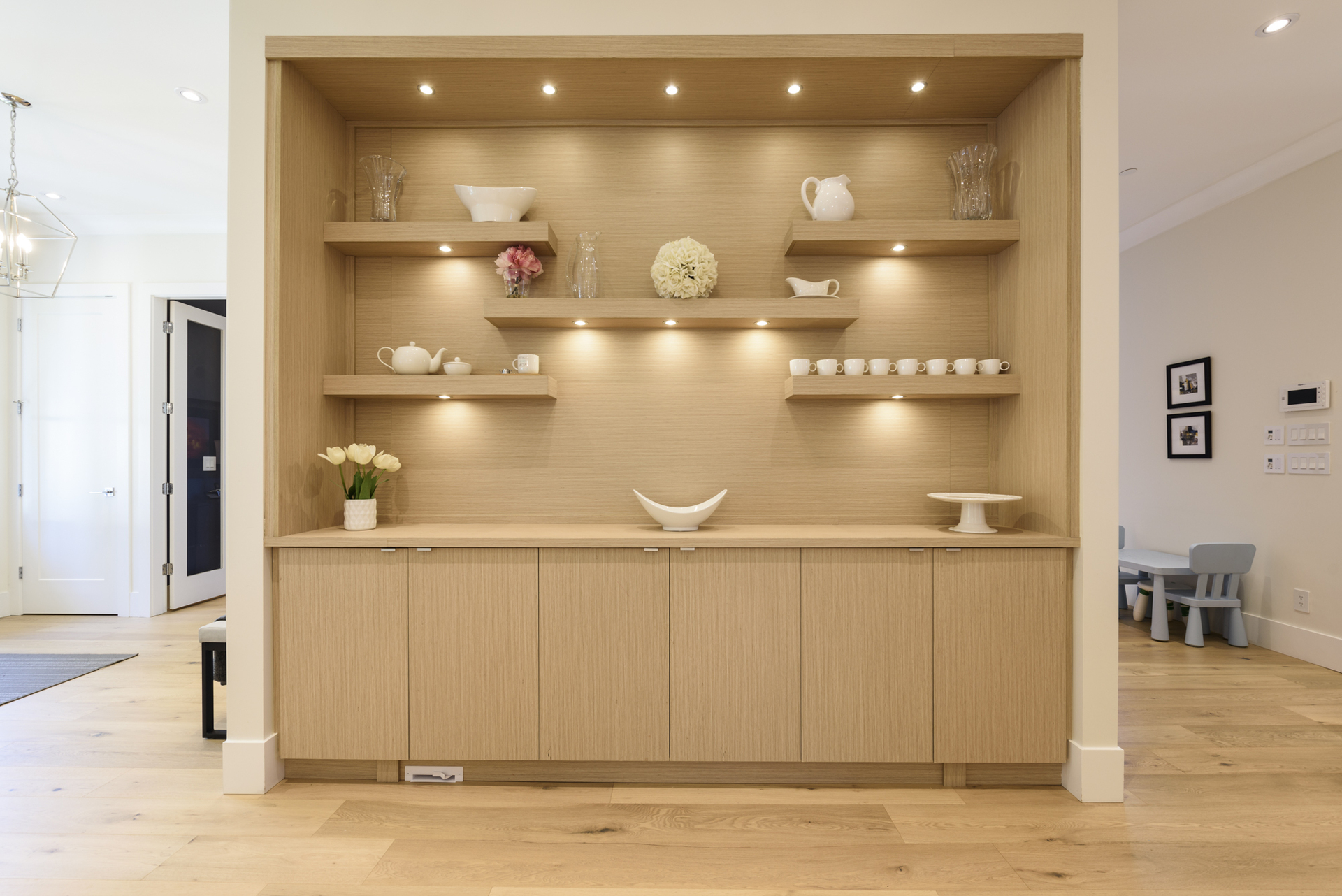 - Hood fan is integrated with same white oak veneer as all flat panel cabinetry