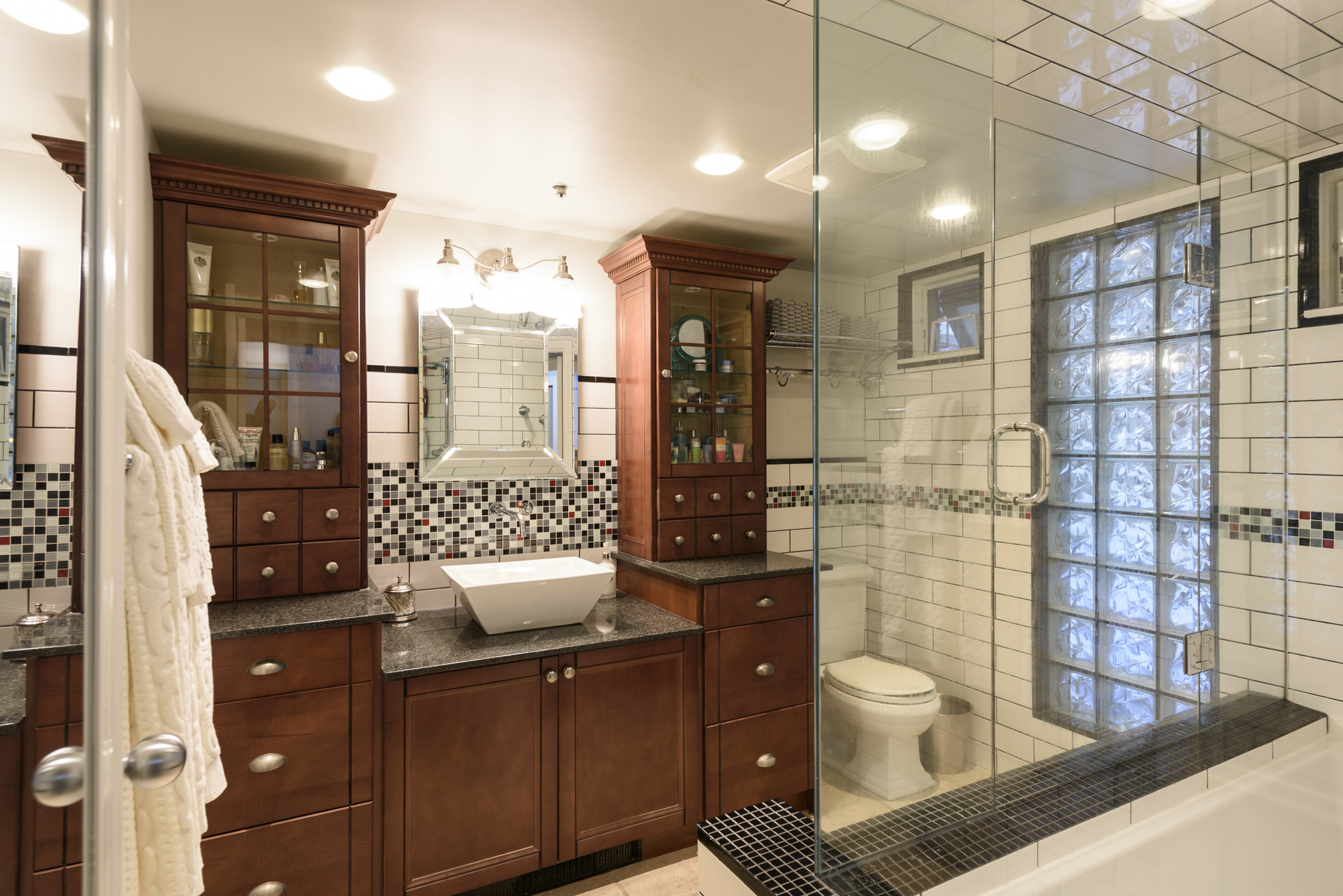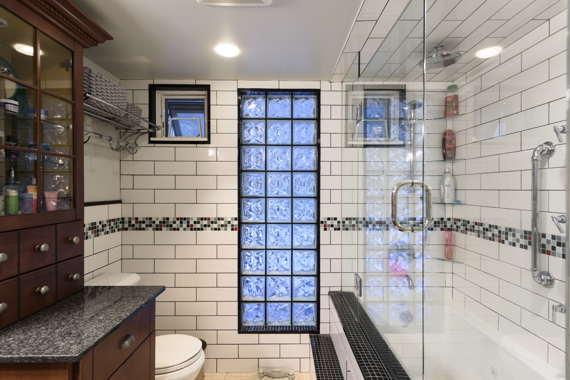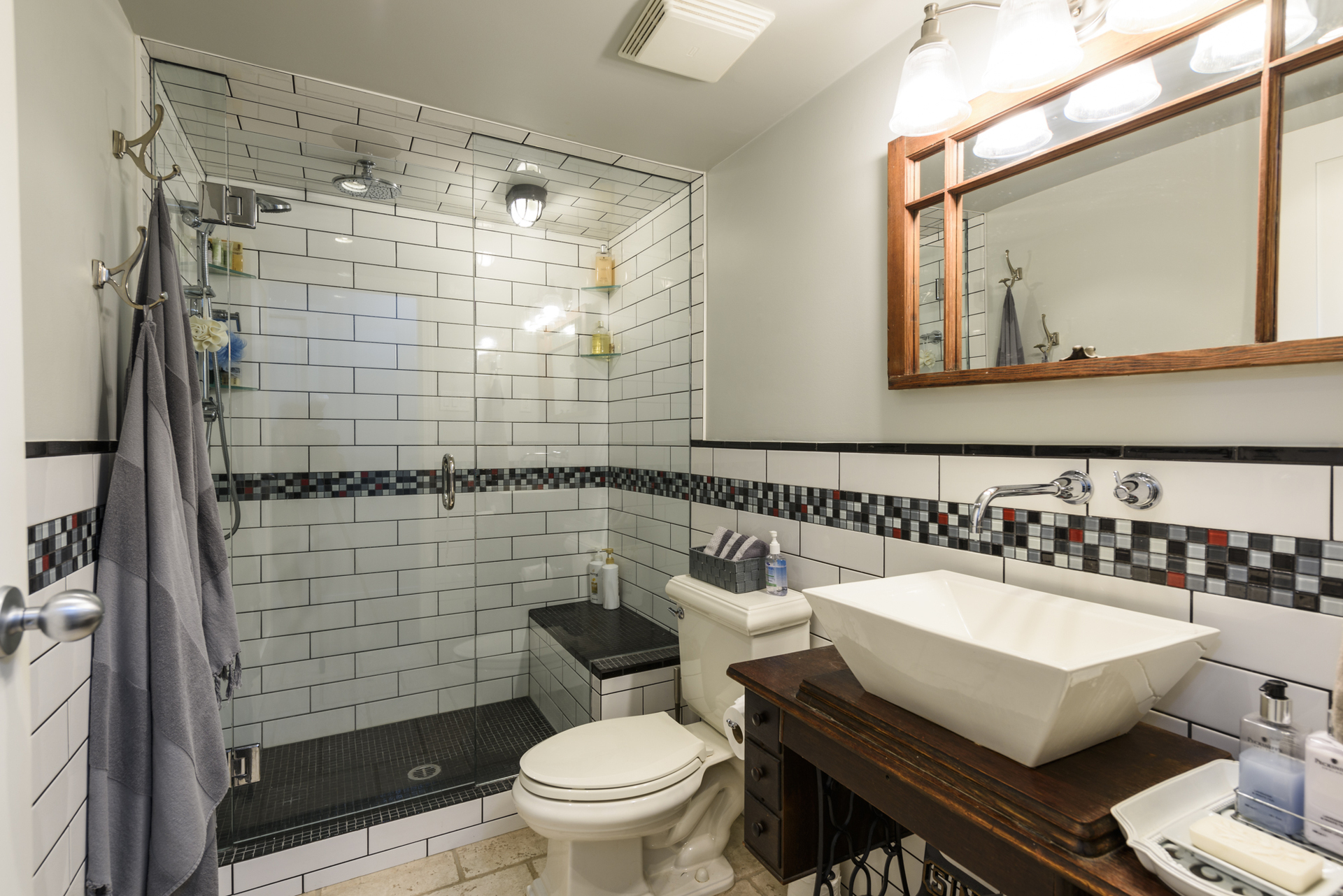 - White subway tiles with mosaic deep coloured mosaic tile detailing