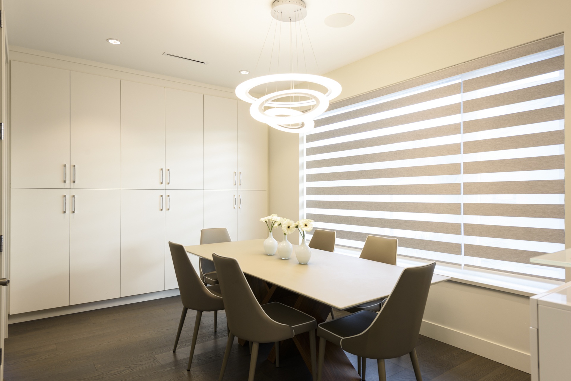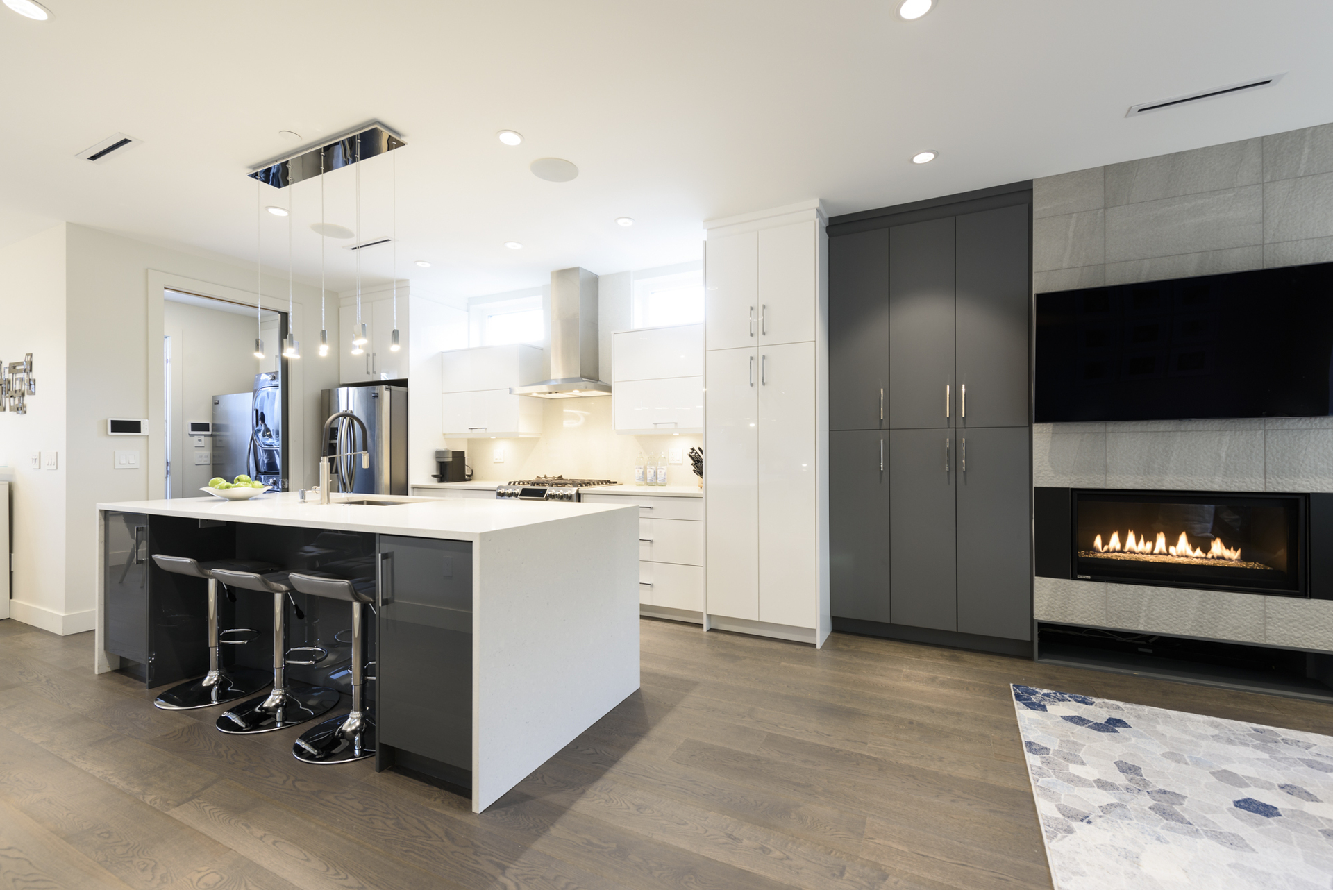 - High gloss flat panel cabinetry with contemporary palette of deep grey and white