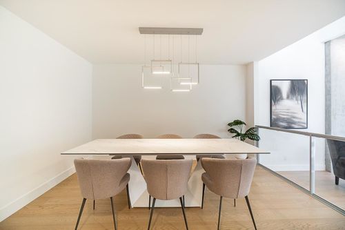 - Formal dining is both separate & open, with glass railing system between the two rooms