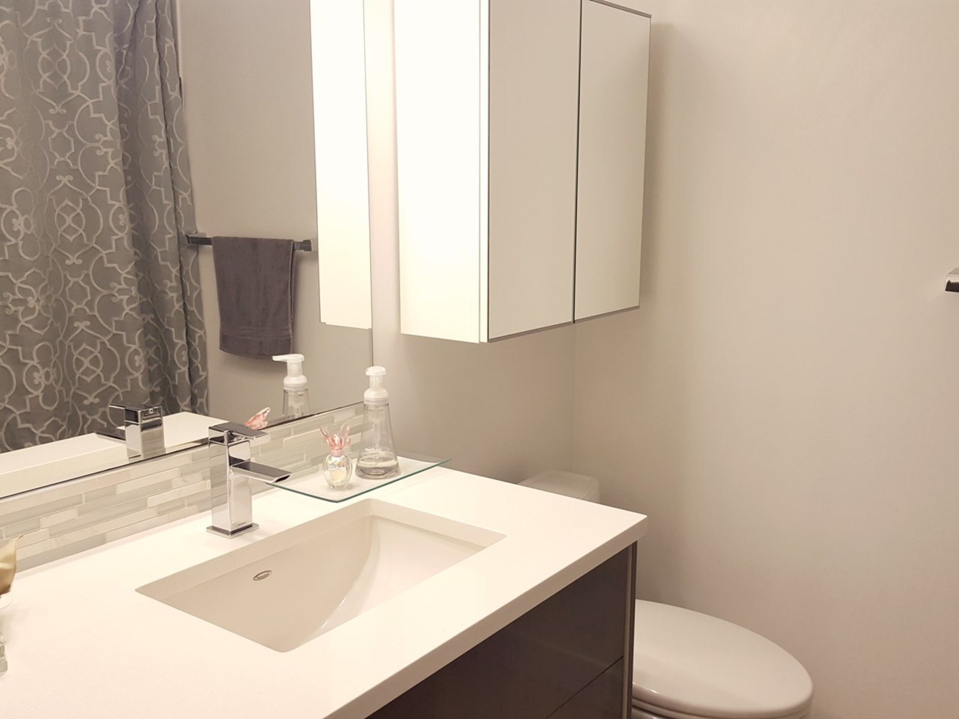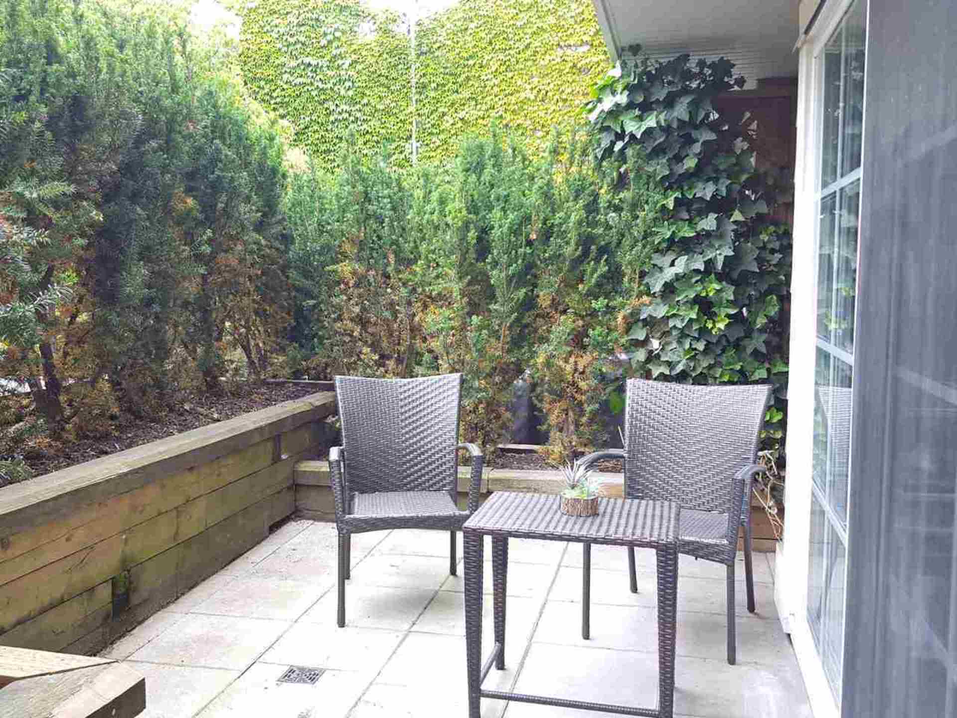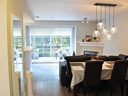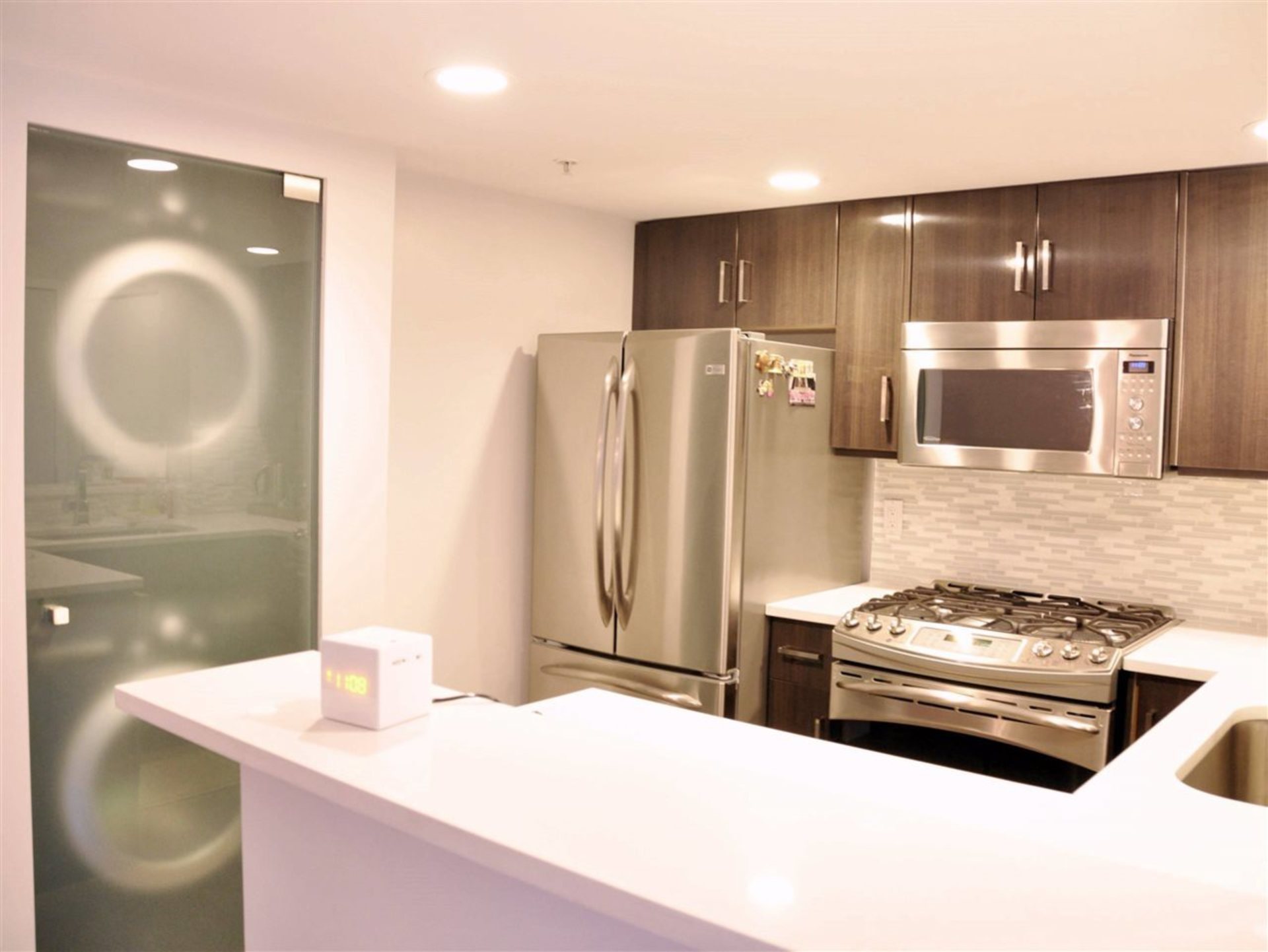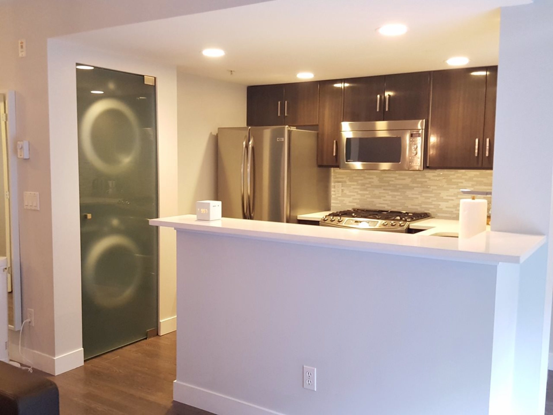 LIBERTE, functionally designed townhome-like Fairview residence with spacious and open 1 bedroom and den layout. Private courtyard patio, open plan kitchen with quality gas range/microwave, quartz counters, soft close cabinets, Moen fixtures, 30" Kraus sink, stainless appliances, newer washer/drye