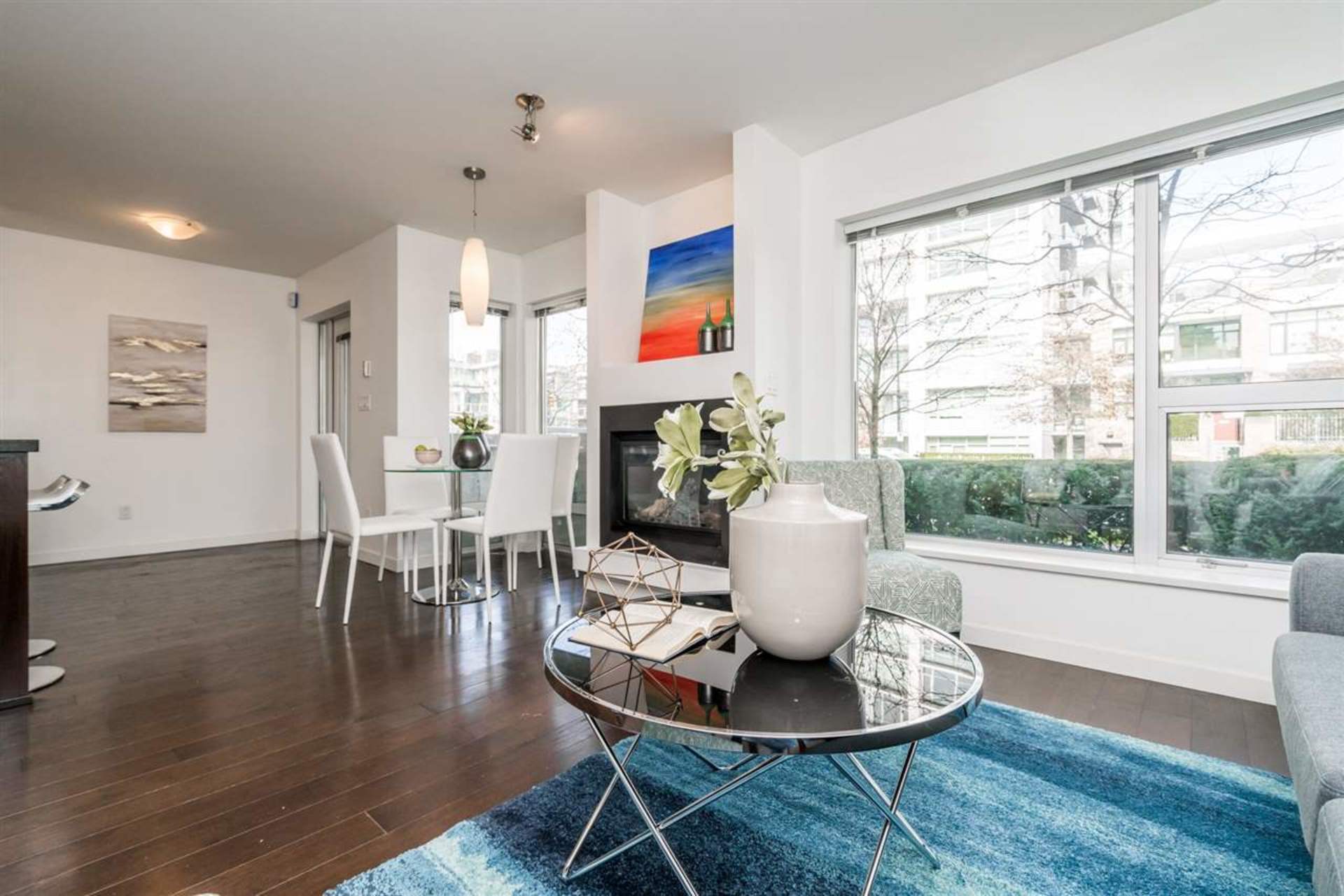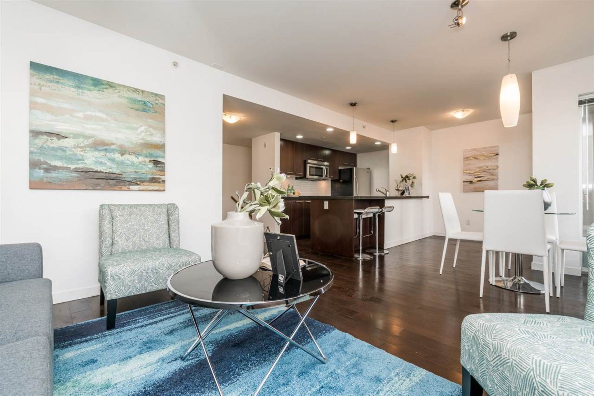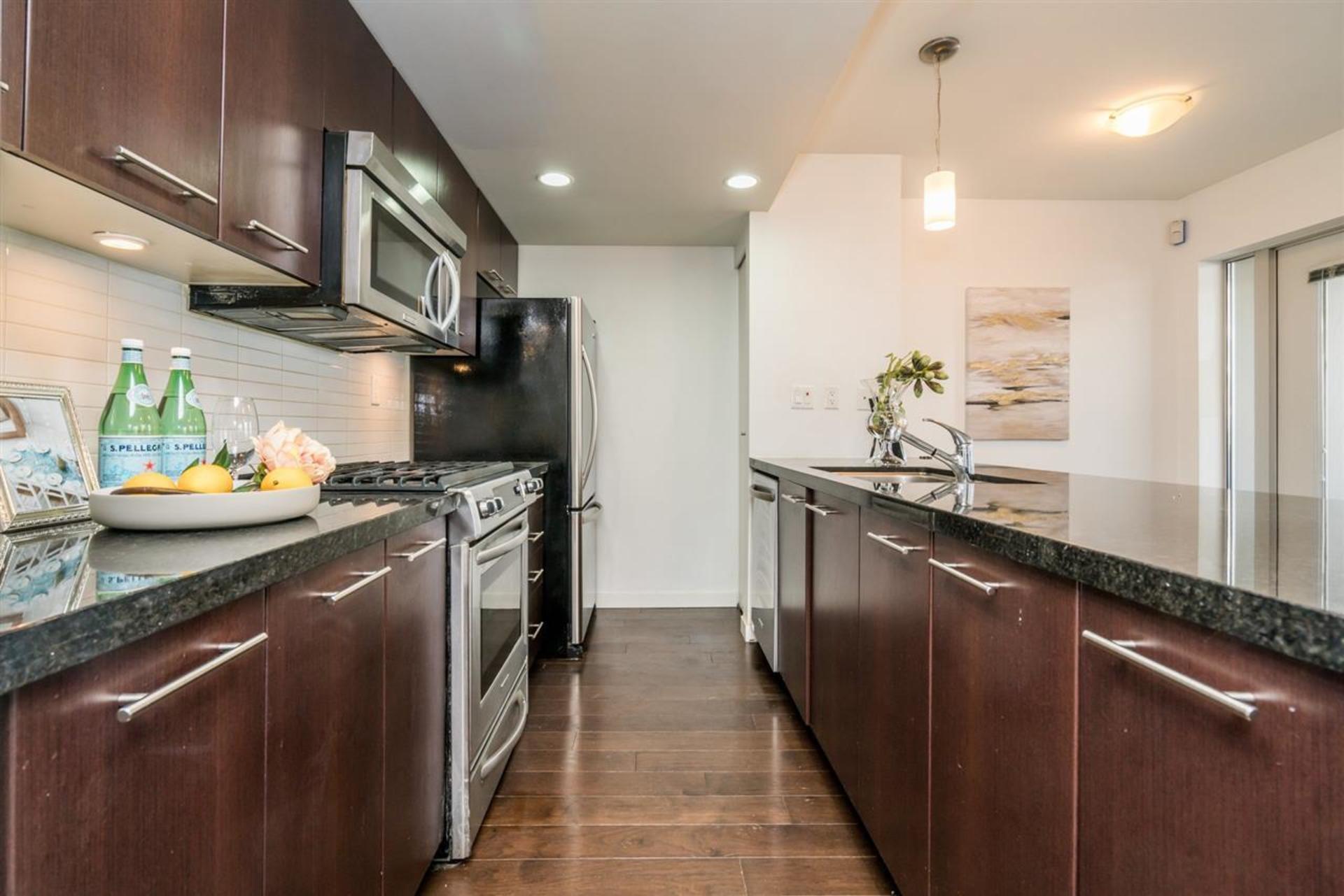 Welcome to ALINA. This concrete building features a 2 bedroom two level unit that has a large private patio. There is access from ground floor for convenience or through the lobby. Very classic design with hardwood flooring and quartz counters to match. Great open space to engage from kitchen to d