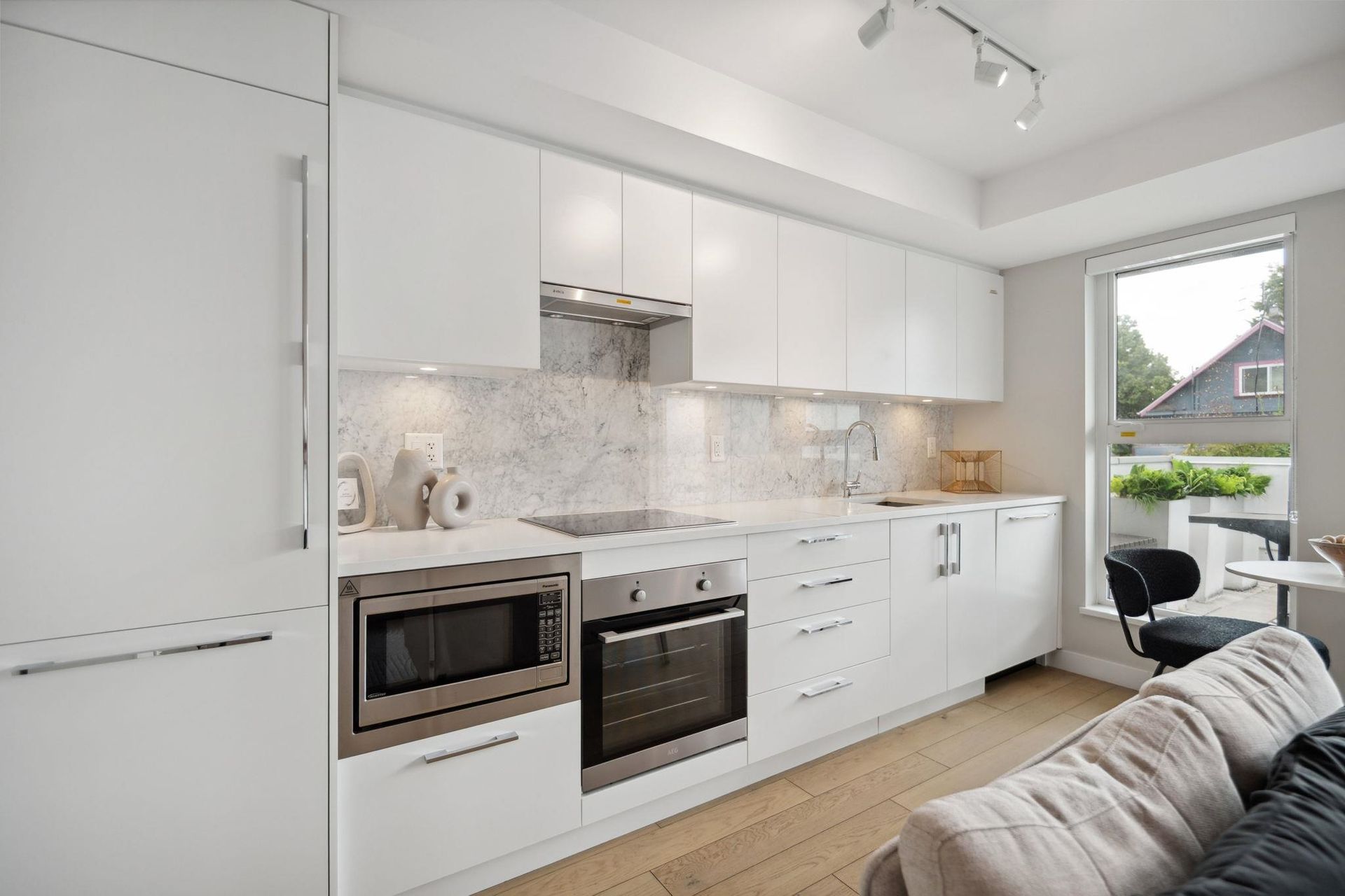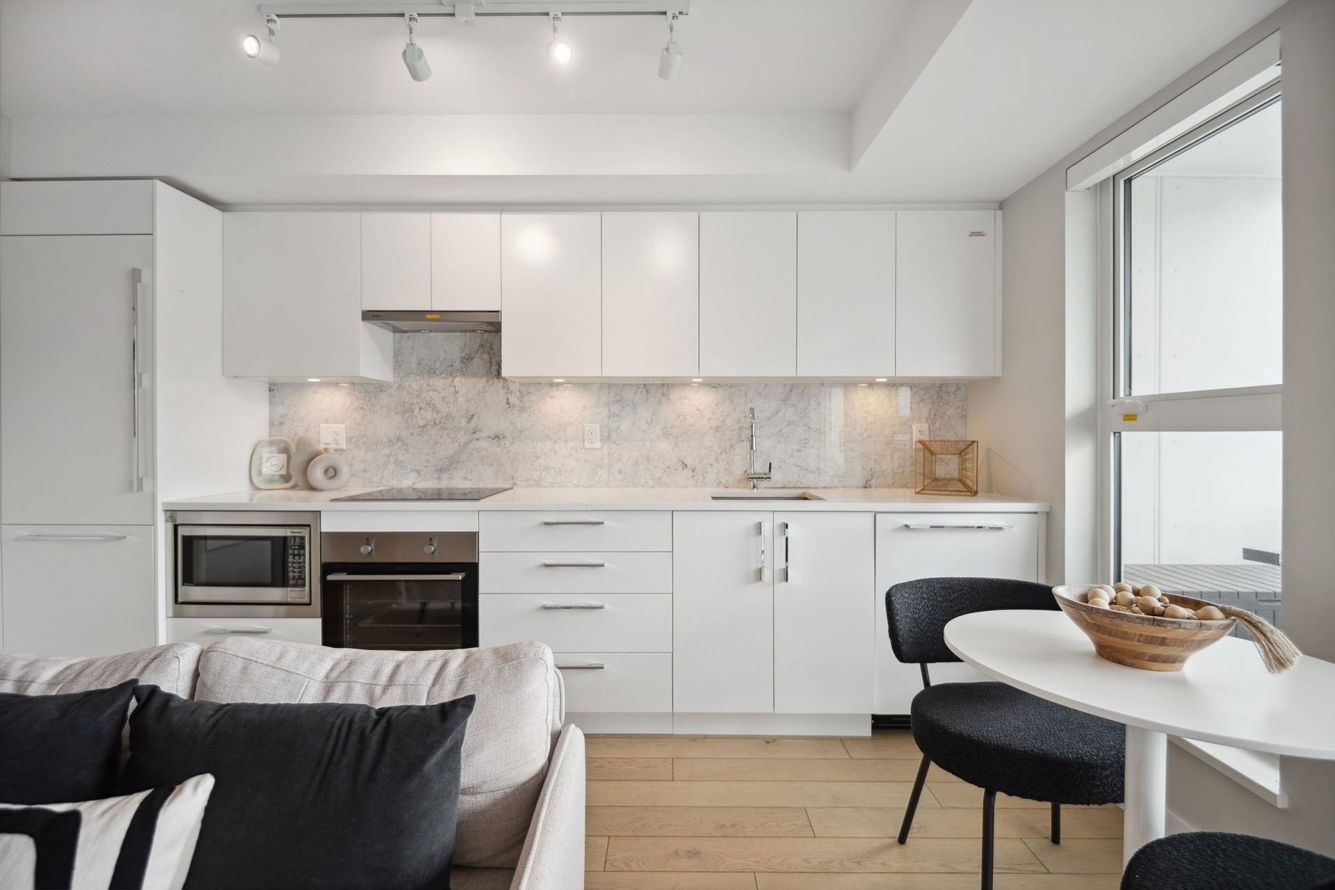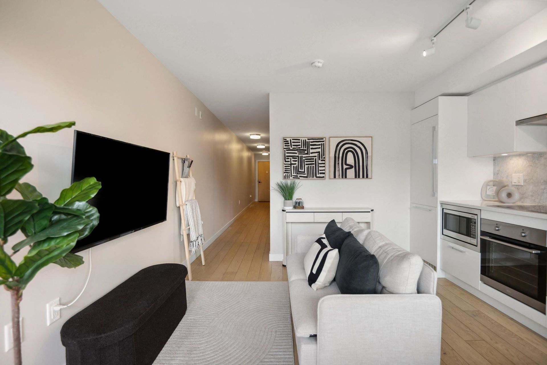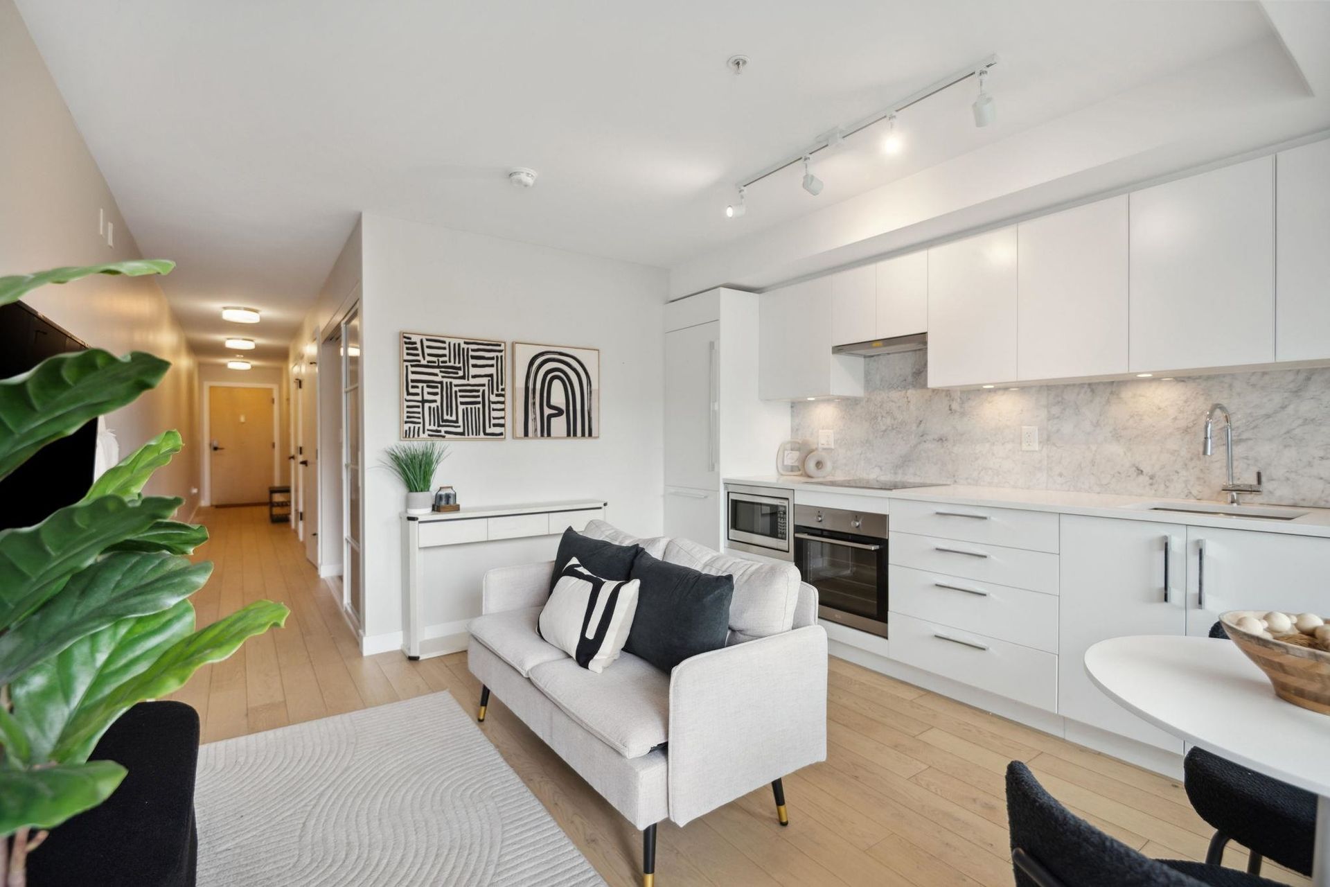 Welcome to Midtown Central by the Peterston Group/PortLiving.This boutique 35-unit building is perfectly located along the Broadway Corridor & Fraser Street. Situated on the quiet side of the complex, this like-new, fully furnished home features a spacious 167 sq ft balcony, unobstructed. Enjoy high-end finishes throughout, including oak engineered hardwood floors, integrated appliances with induction cooktop, Carrera marble backsplash, and a luxurious bathroom with in-floor heated herringbone tile and a rain shower. The large walk-in closet doubles as a home office or flex space. Steps to shopping, restaurants, and the future Broadway Subway Station, this home is perfect for first-time buyers or investors looking for a move-in-ready property. Comes with parking, locker & bike locker.