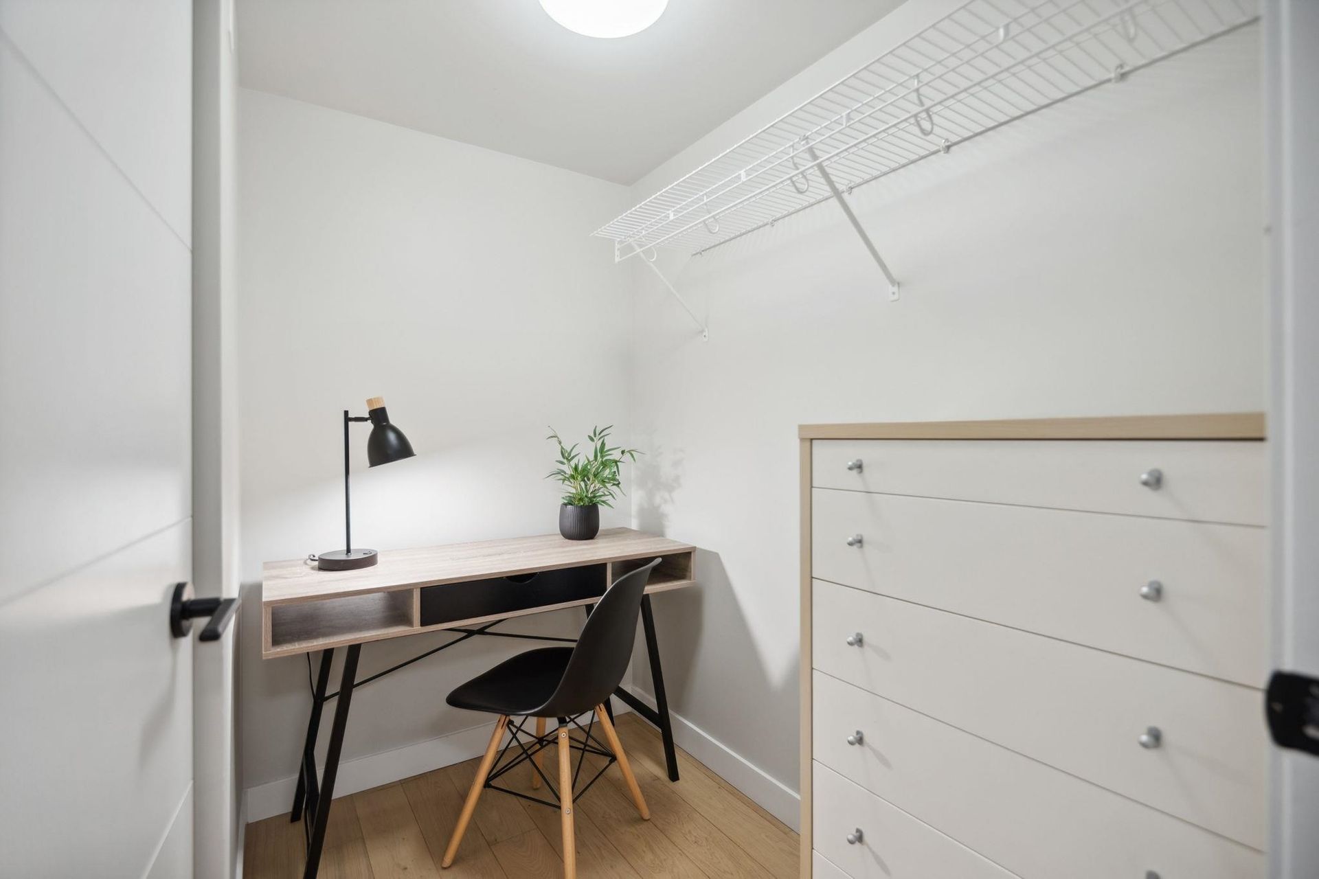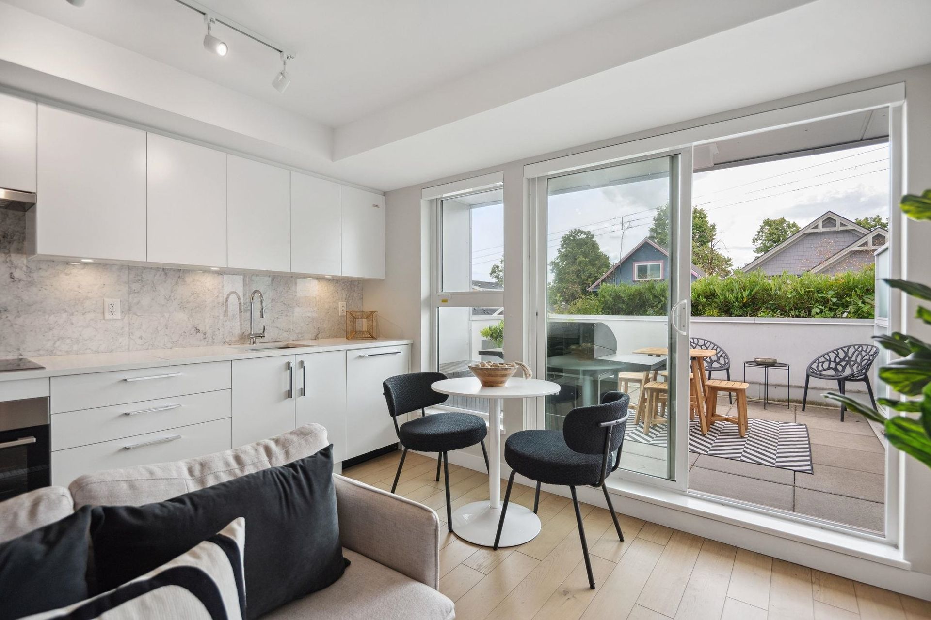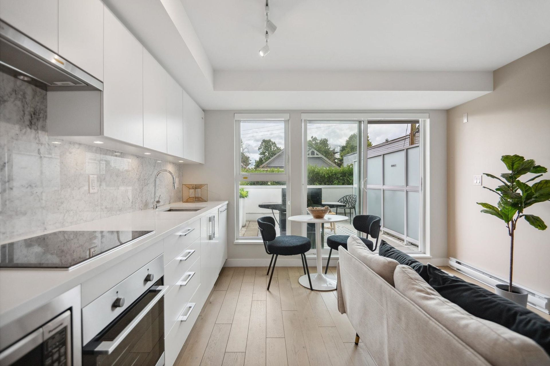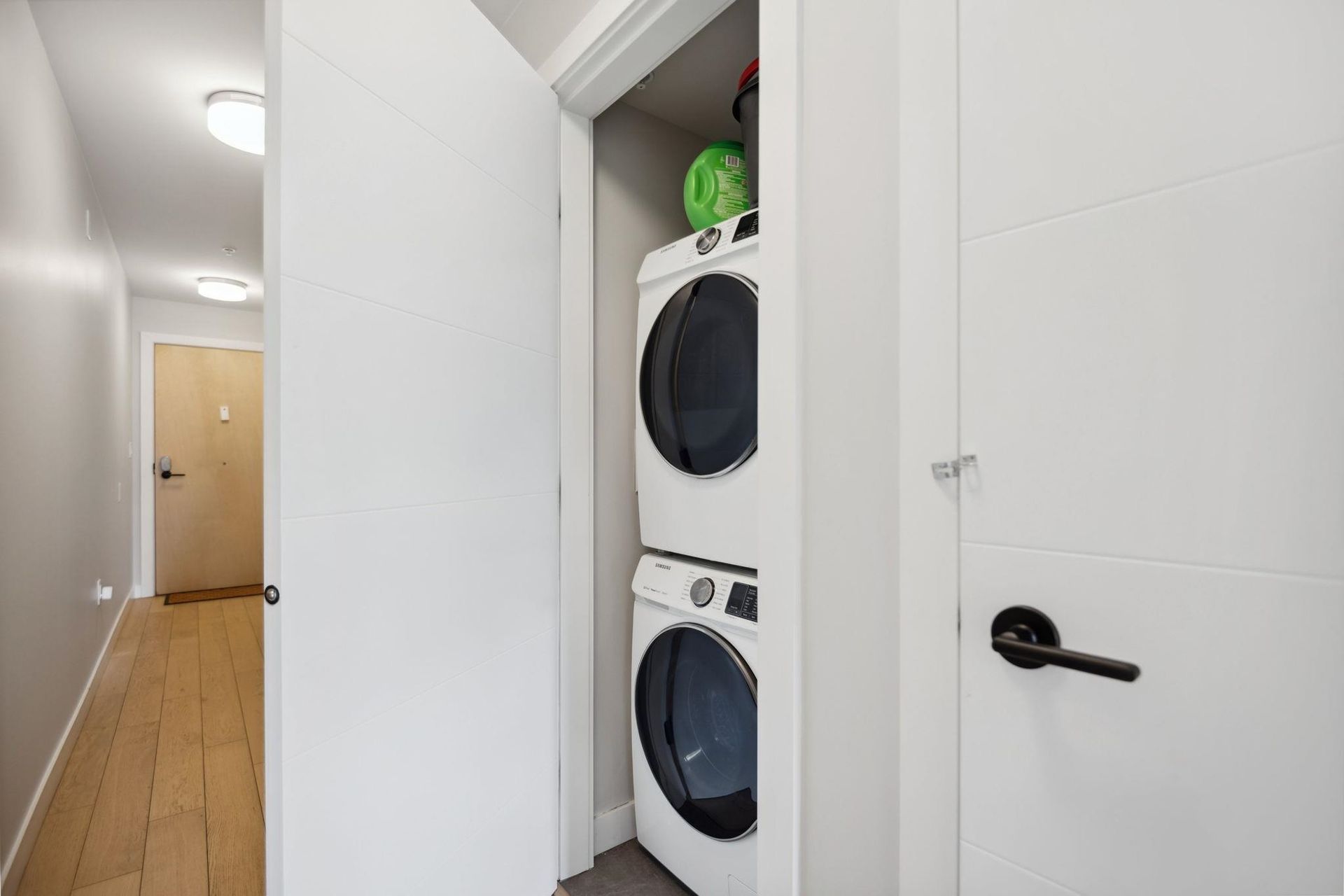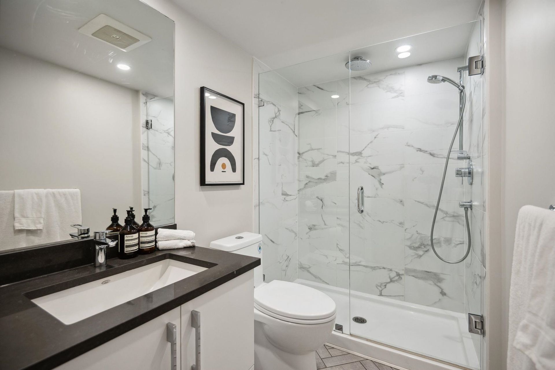 Welcome to Midtown Central by the Peterston Group/PortLiving.This boutique 35-unit building is perfectly located along the Broadway Corridor & Fraser Street. Situated on the quiet side of the complex, this like-new, fully furnished home features a spacious 167 sq ft balcony, unobstructed. Enjoy high-end finishes throughout, including oak engineered hardwood floors, integrated appliances with induction cooktop, Carrera marble backsplash, and a luxurious bathroom with in-floor heated herringbone tile and a rain shower. The large walk-in closet doubles as a home office or flex space. Steps to shopping, restaurants, and the future Broadway Subway Station, this home is perfect for first-time buyers or investors looking for a move-in-ready property. Comes with parking, locker & bike locker.