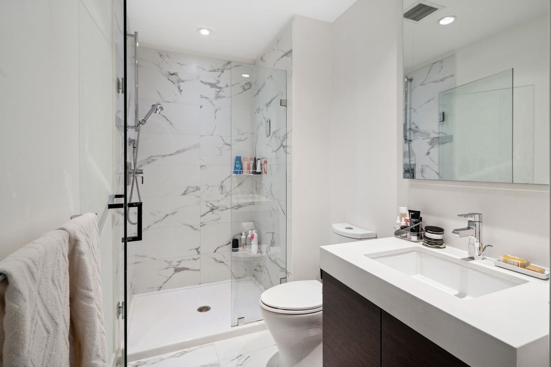 - Polished white quartz counter tops and white undermount Kohler porcelain sinks