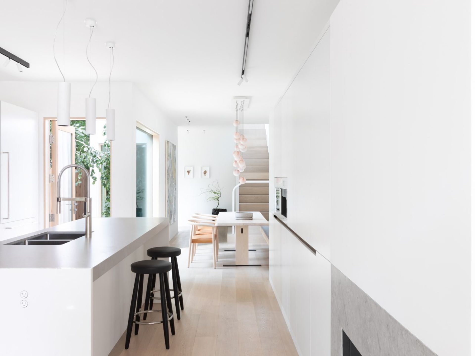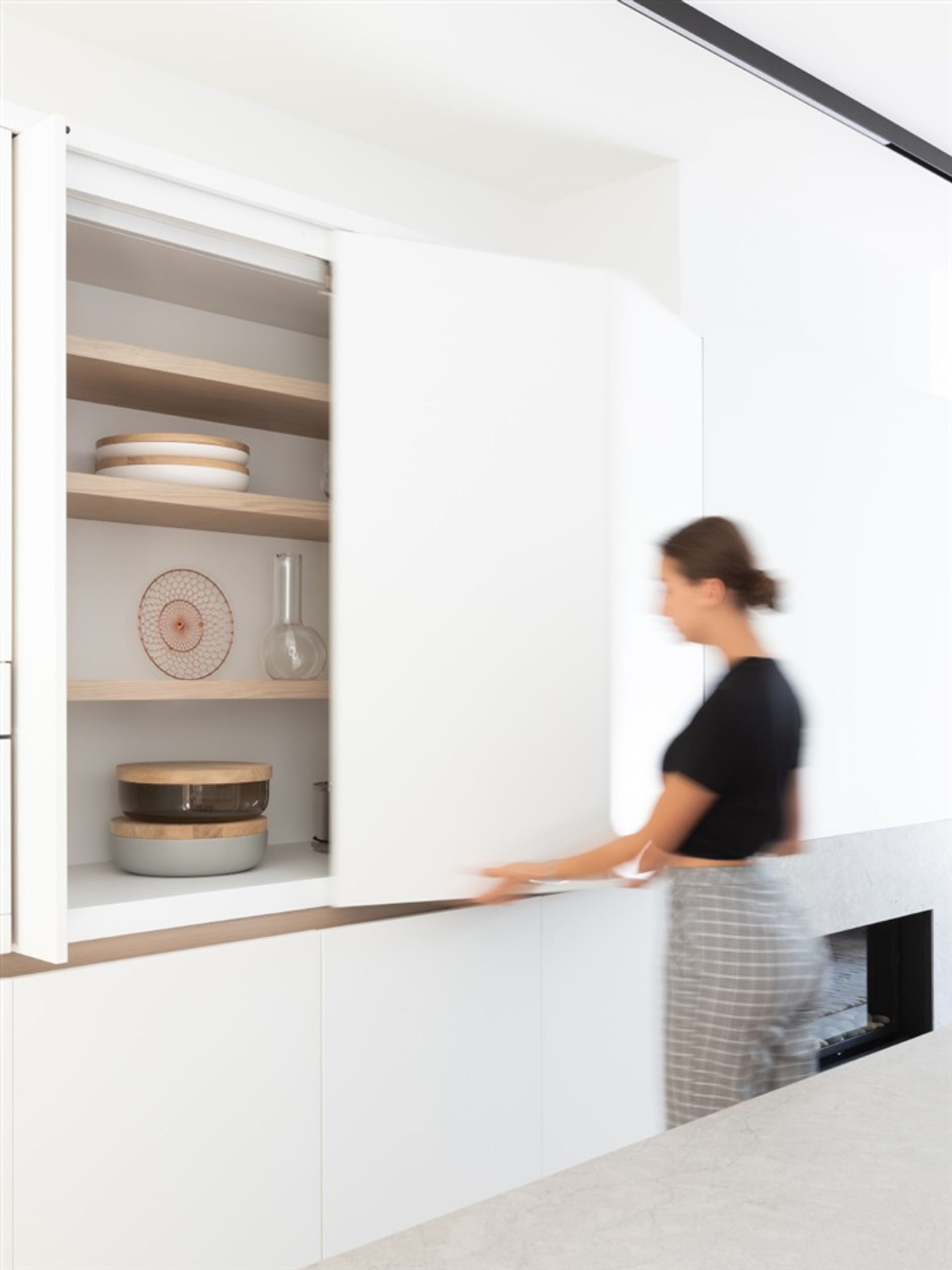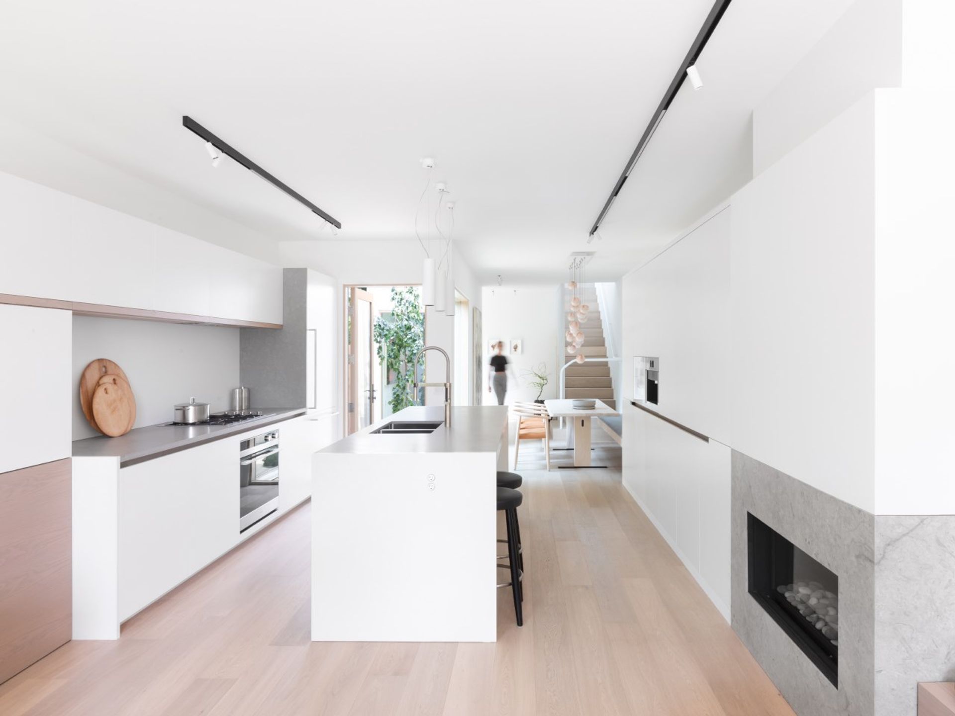 - Linear high efficiency fireplace - custom limestone flush with adjacent finishes