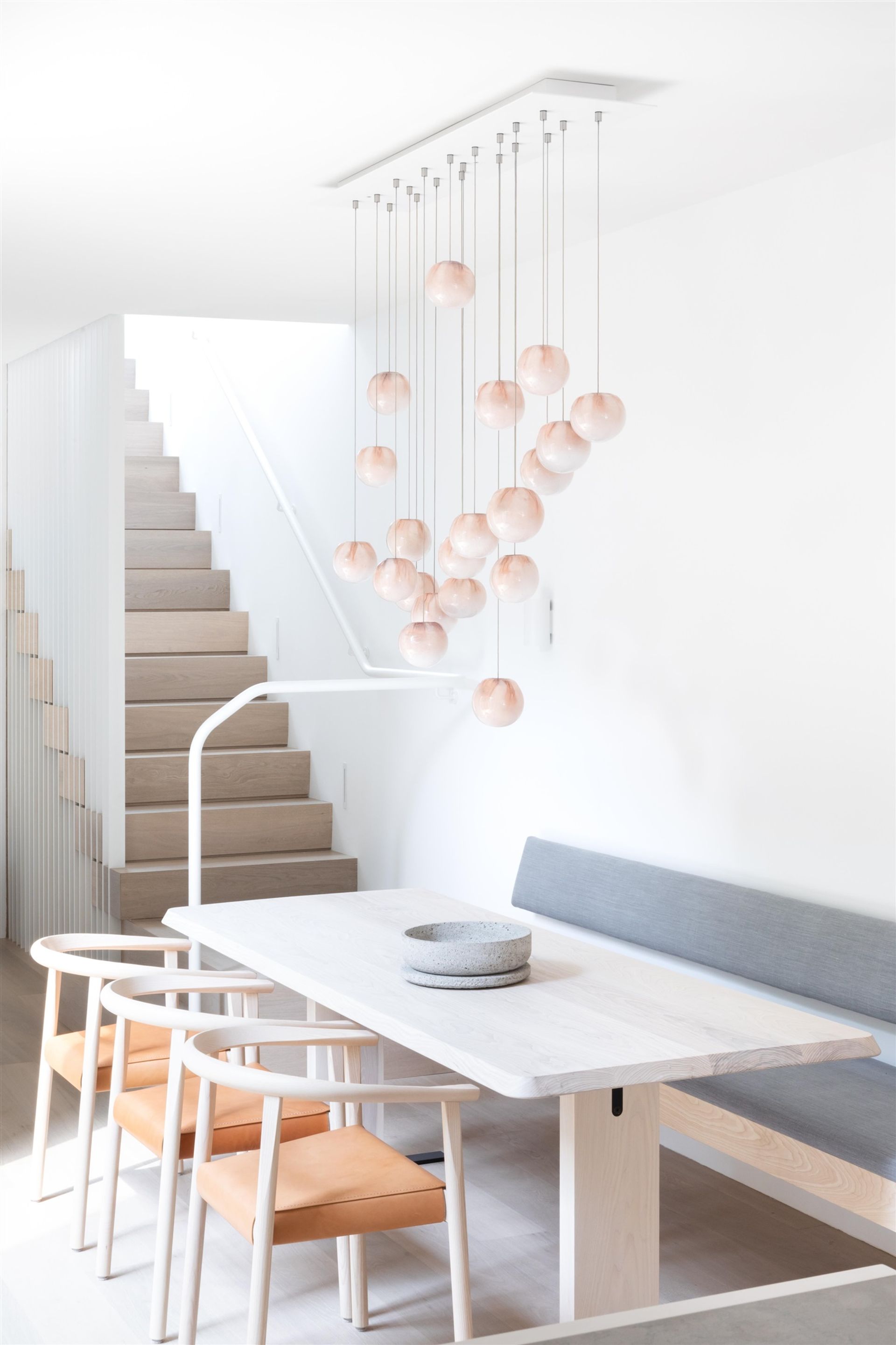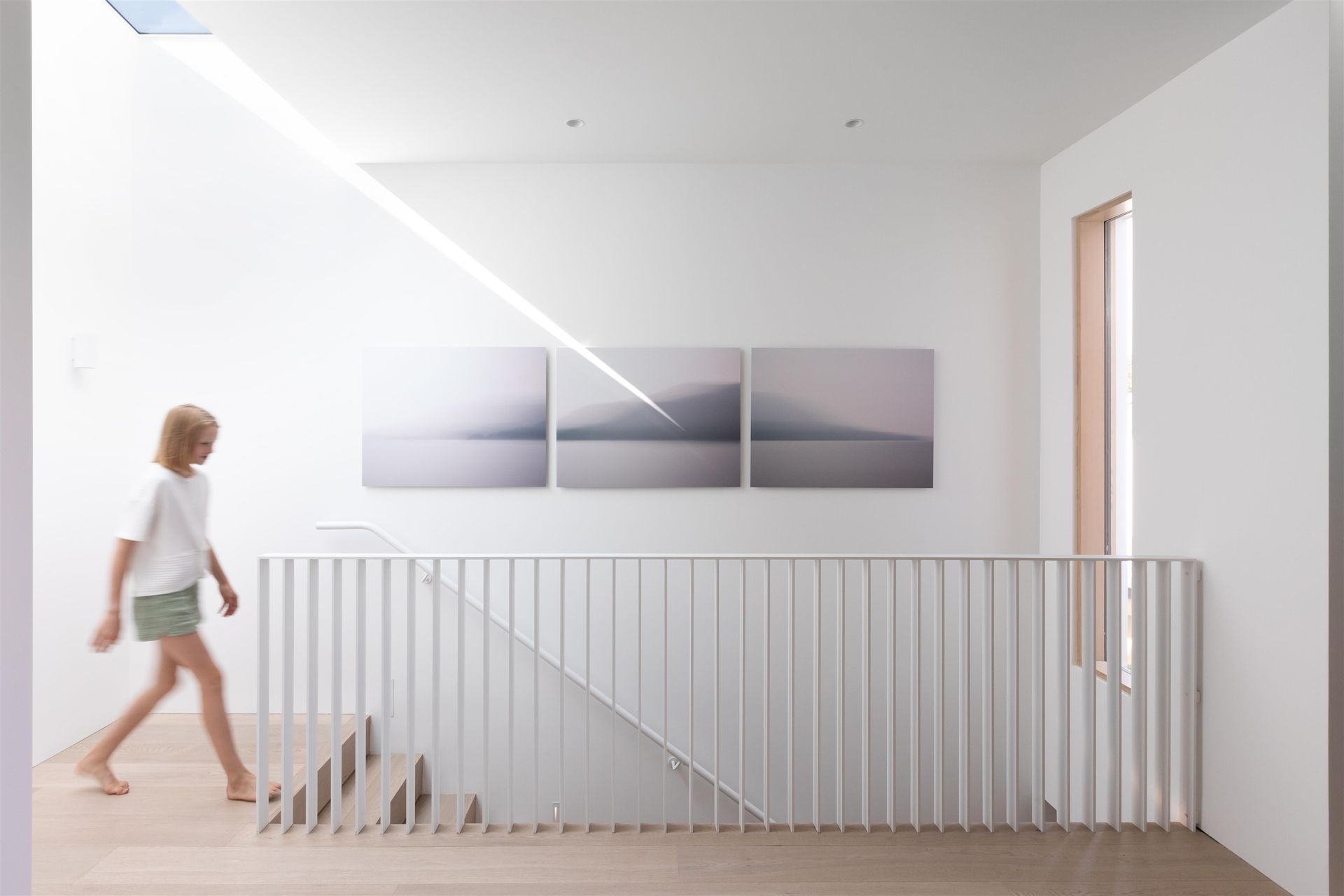 - An absolute one-of-a-kind, white powder coated metal staircase guard that runs continuously from main floor to 2nd floor with dramatic custom lights lighting up the steps