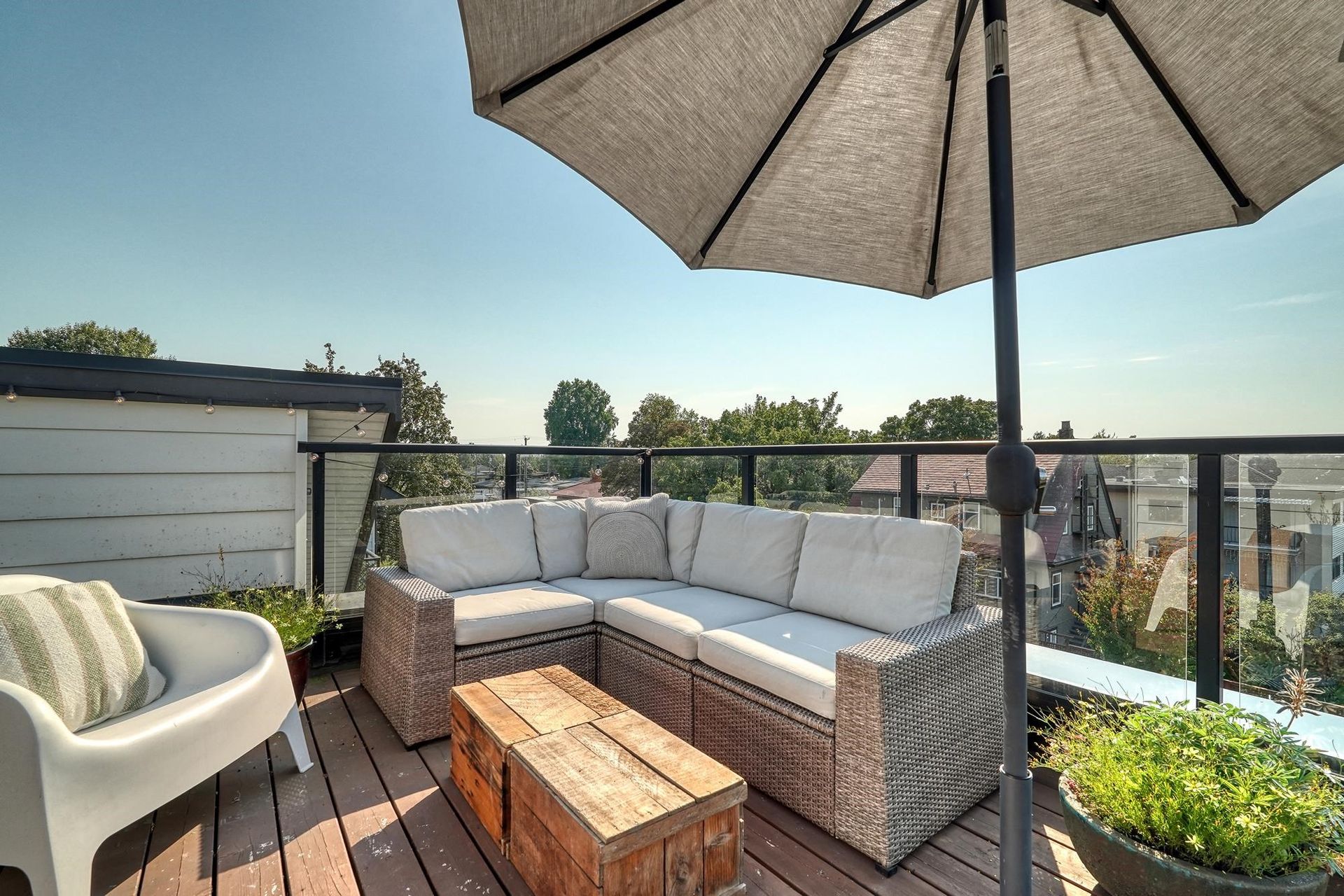 Welcome to 5962 St. George! This nearly 1500 sqft, 2-level townhome in the sought-after Oliver by Vicini, offers a wonderful blend of space, style & community. The bright SW corner fills the home with natural light. The main level features a spacious, separated living & dining area, a chef’s kitchen with gas cooktop, large pantry, & walk-out patio—perfect for entertaining. A full bath & ample storage complete this floor. Upstairs are 3 bedrooms on 1 level, including a generous primary with walk-in closet & private balcony. Finally, the top level has a wonderful rooftop deck with mountain views, the perfect spot to unwind with friends & a glass of wine. Enjoy being steps to Memorial South Park, Macdonald Park, & the shops and restaurants of Fraser.