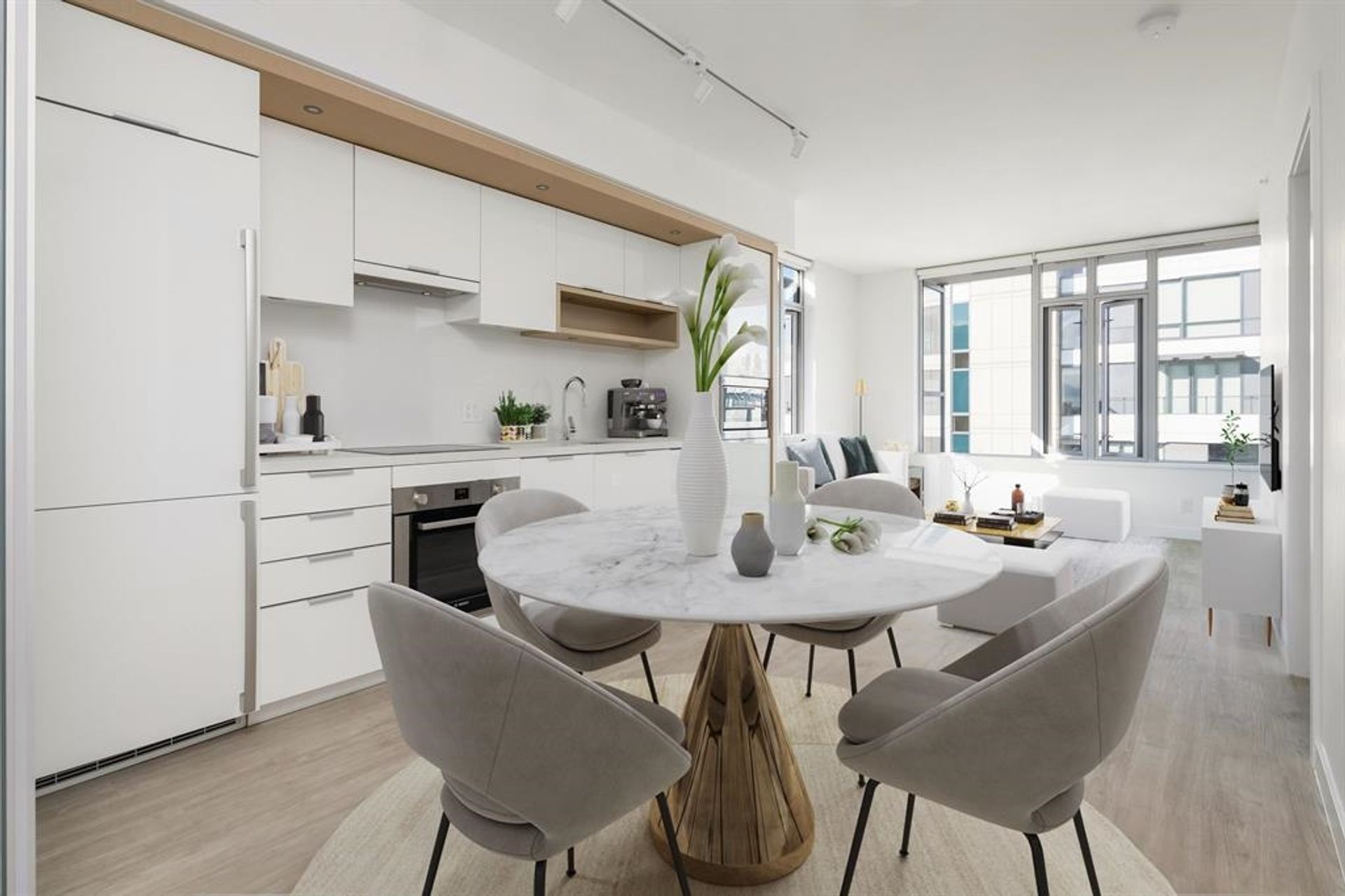 - Open concept living, kitchen, and dining area