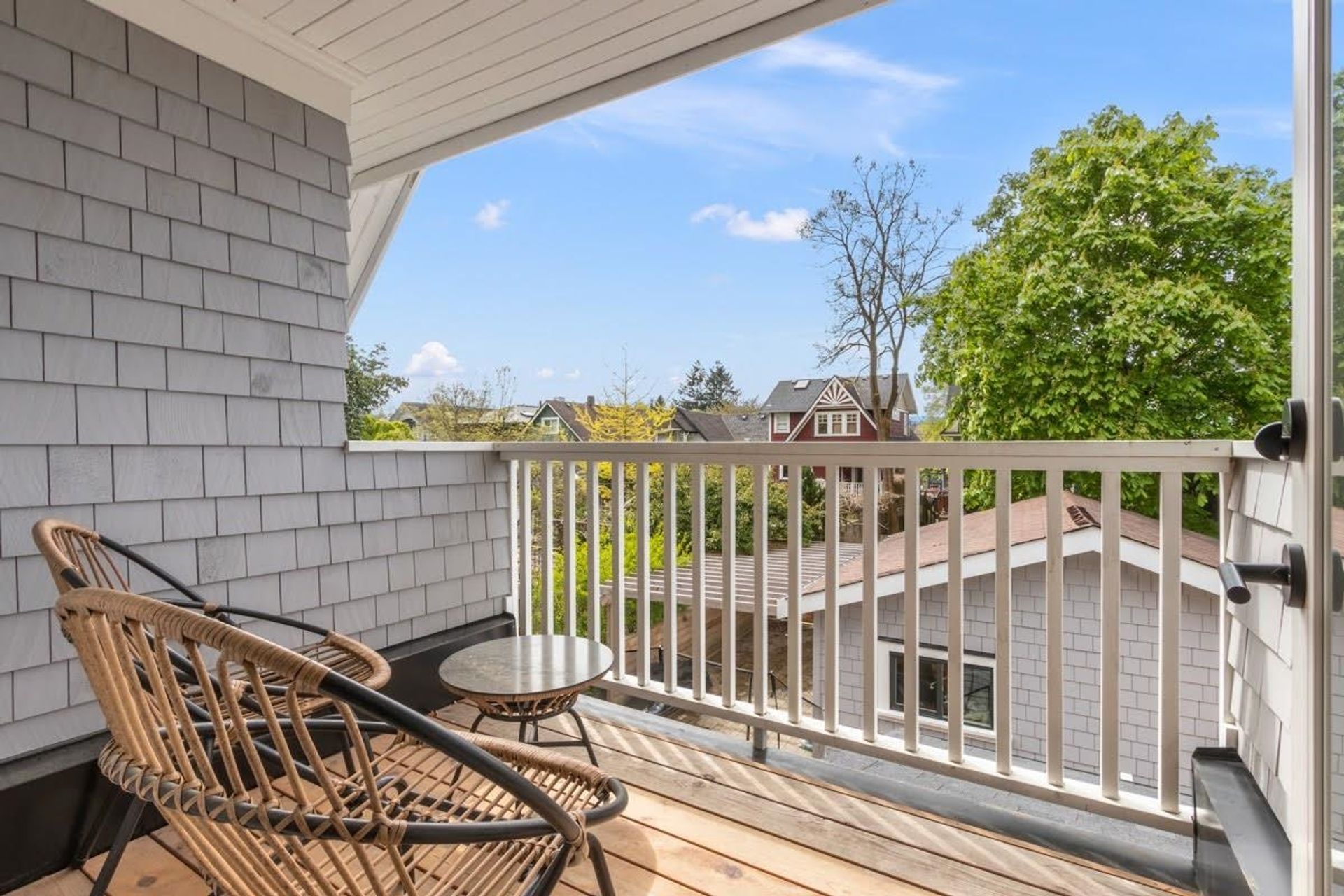 - West-facing deck off kitchen with French doors