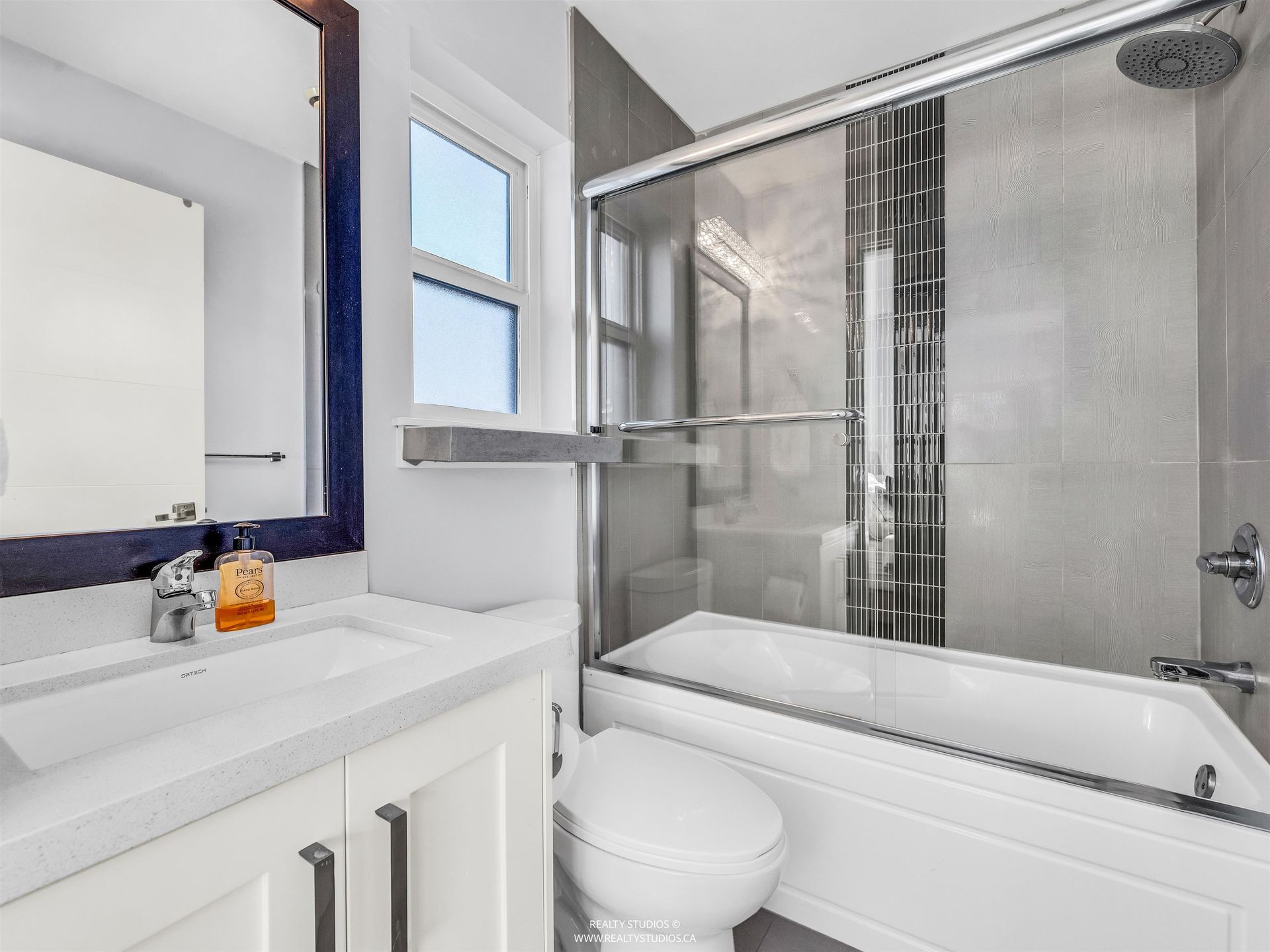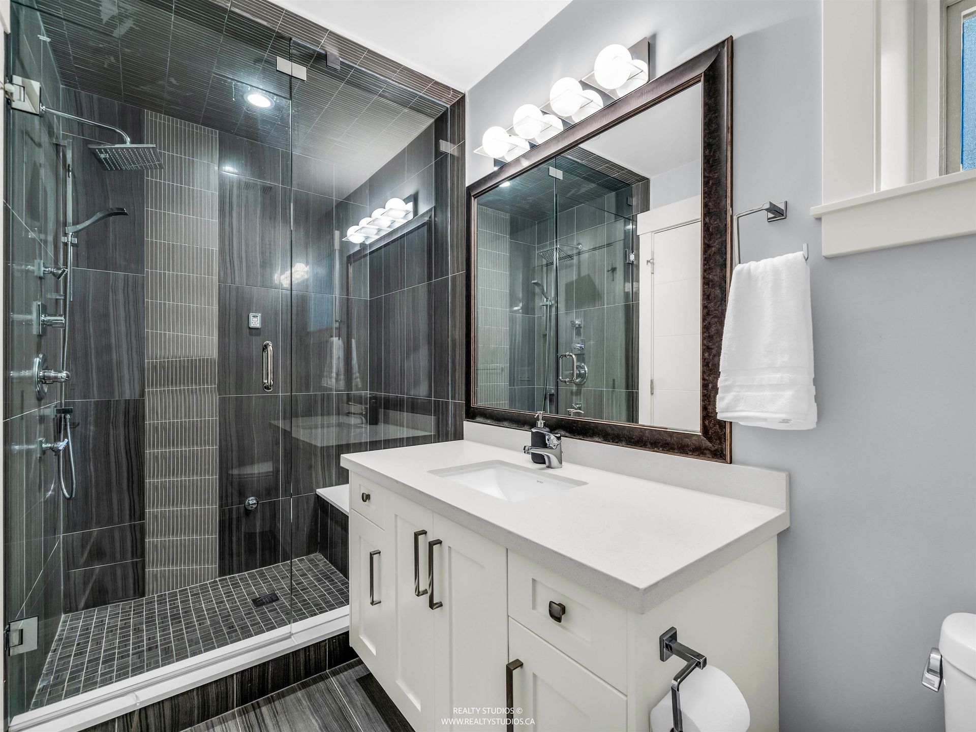 - 4-piece bathroom with vanity storage and tiled shower with seat