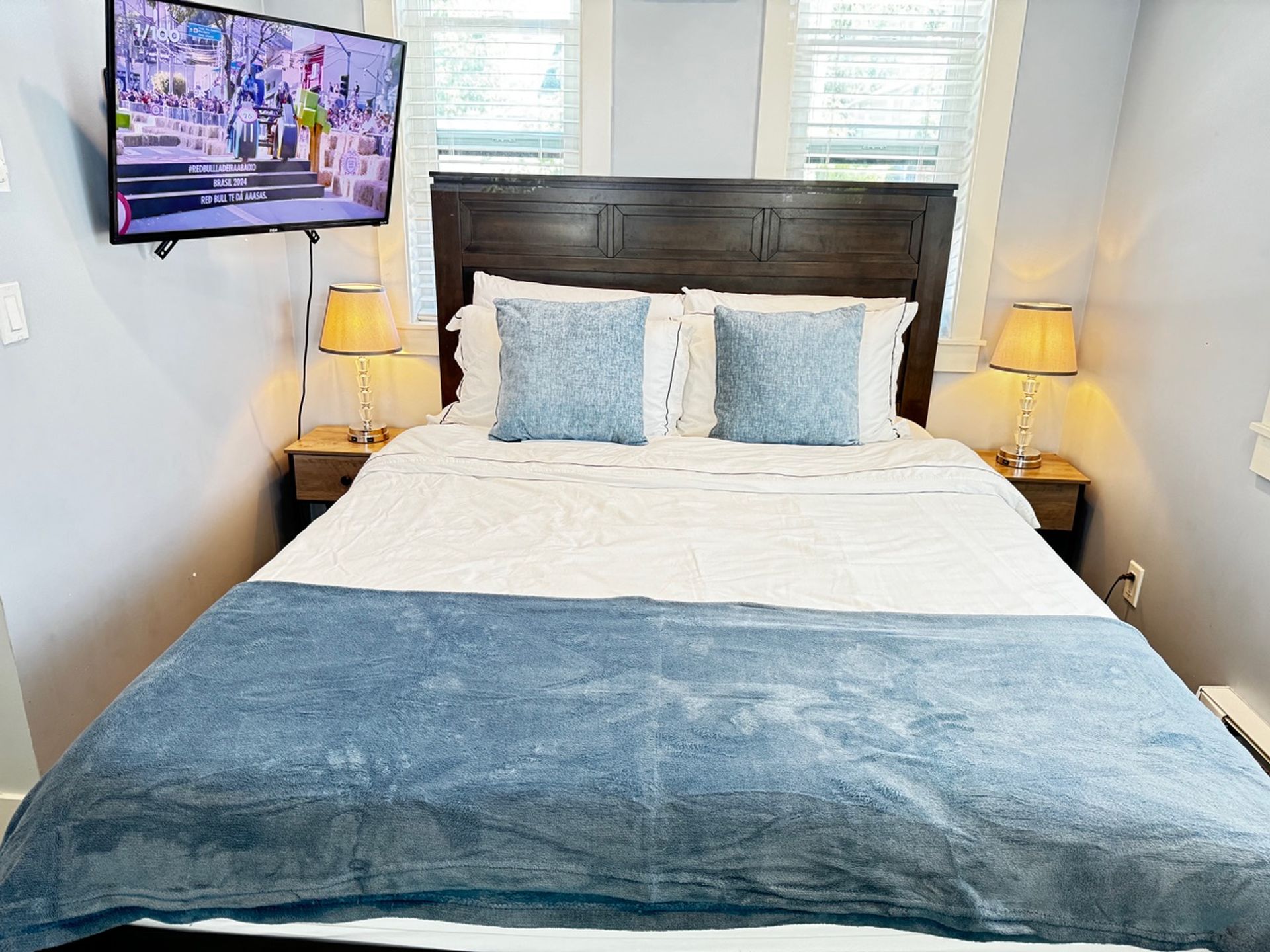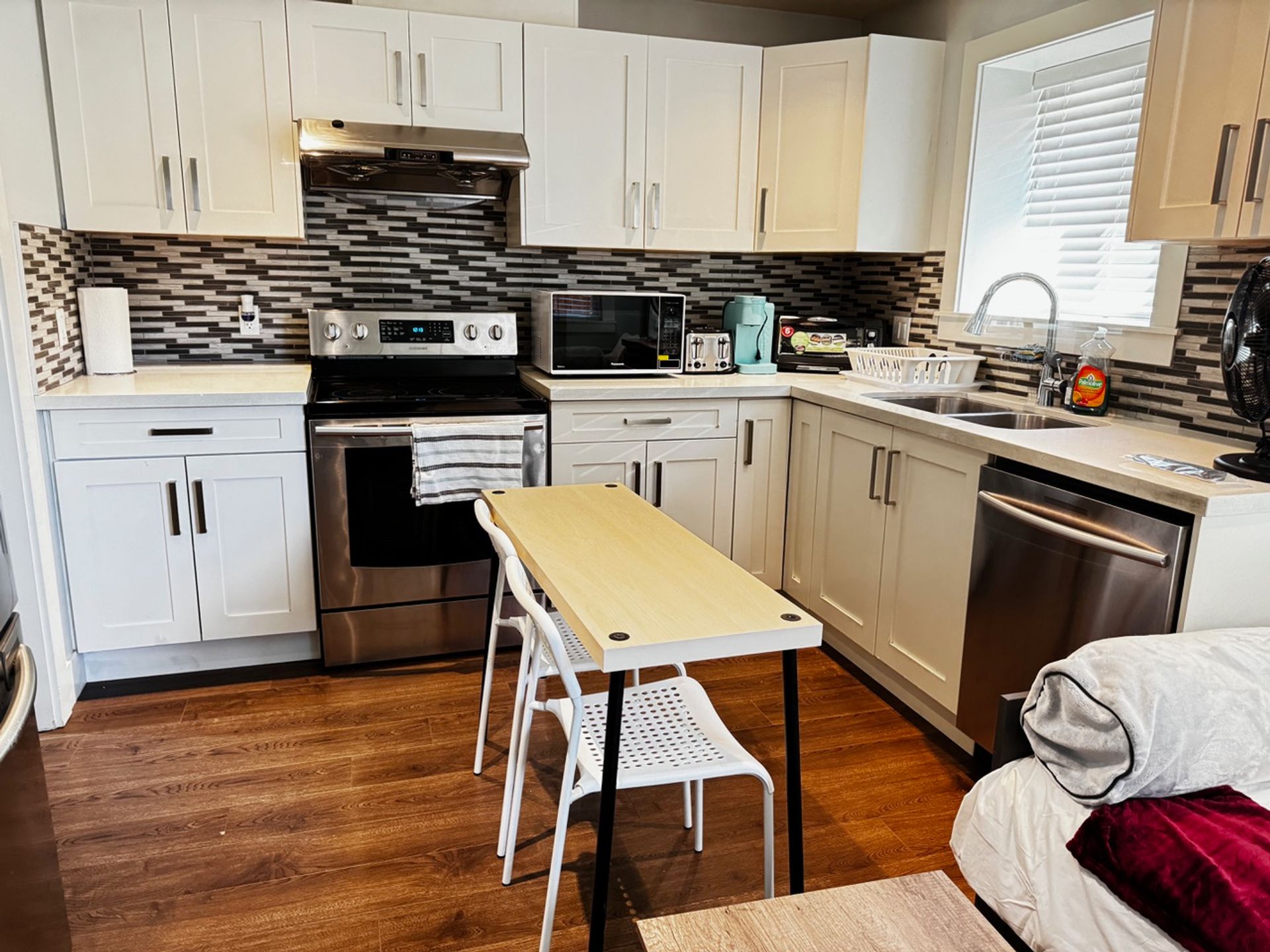 - Full-size kitchen with stainless appliances, peninsula seating, and washer/dryer