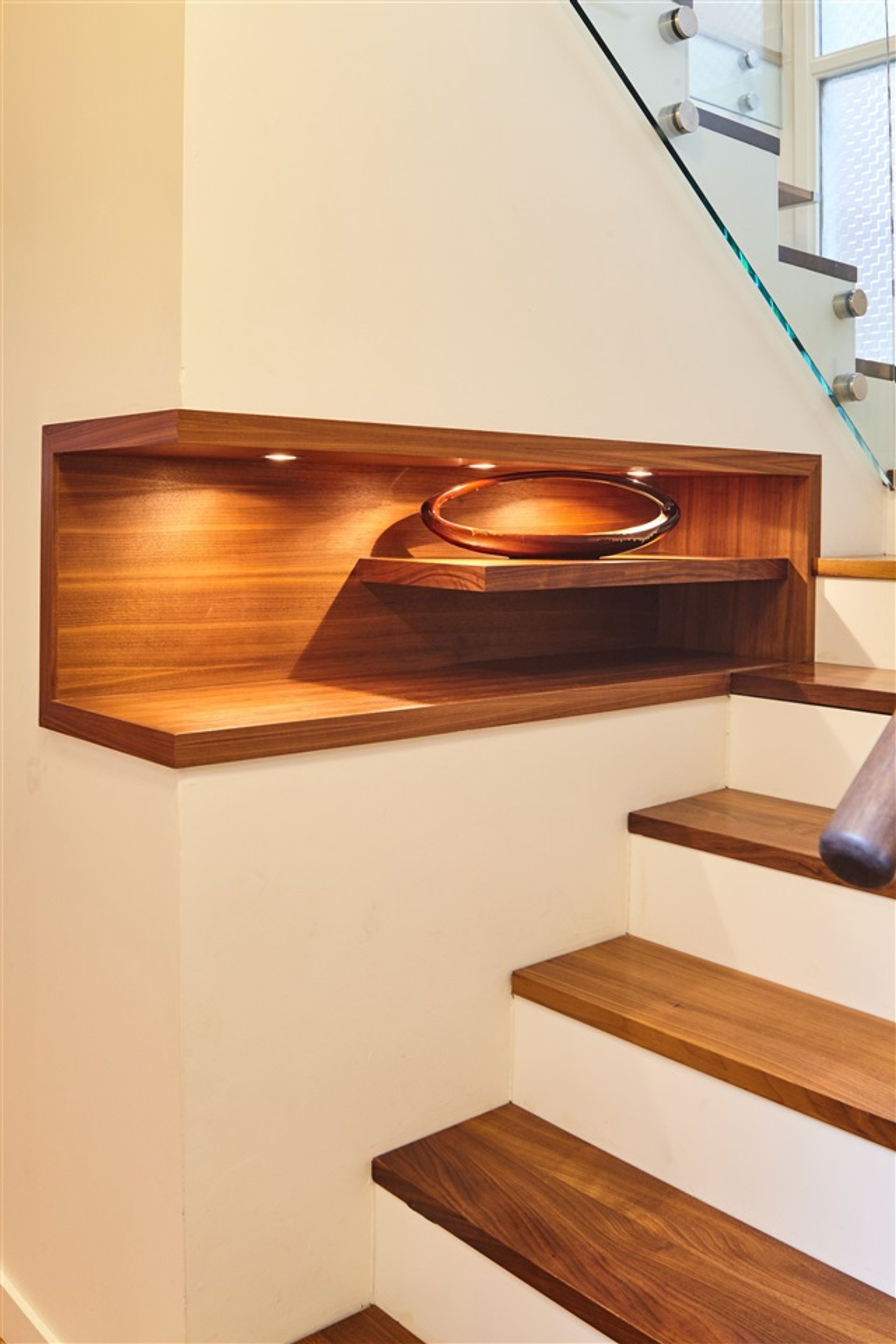 - All woodwork custom designed and built by Christian Woo, including open concept walnut stairwell with Corian kicks, custom walnut cutouts at bottom of stairs, and all wood seating with storage under the front windows in living room