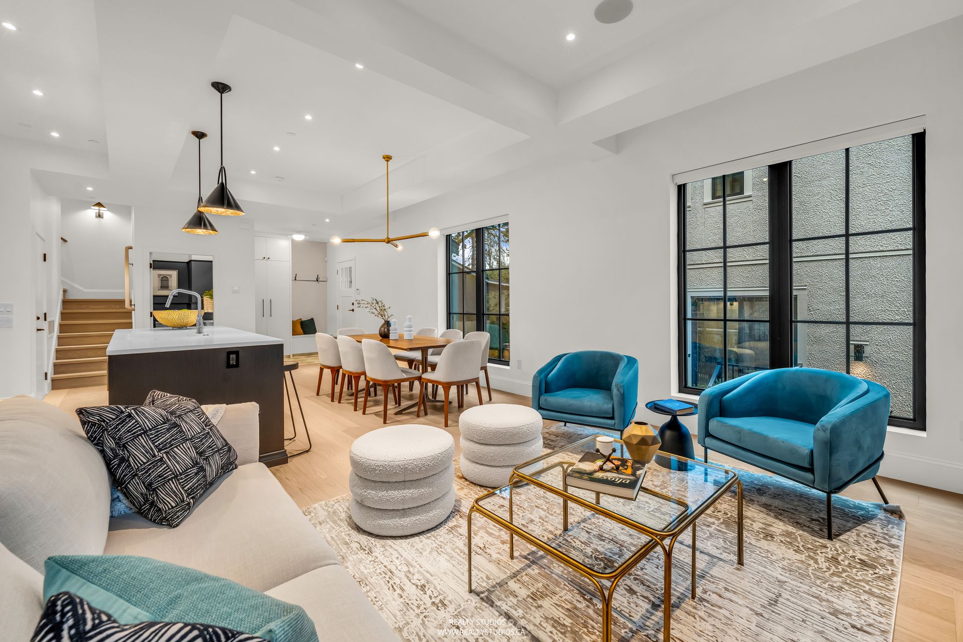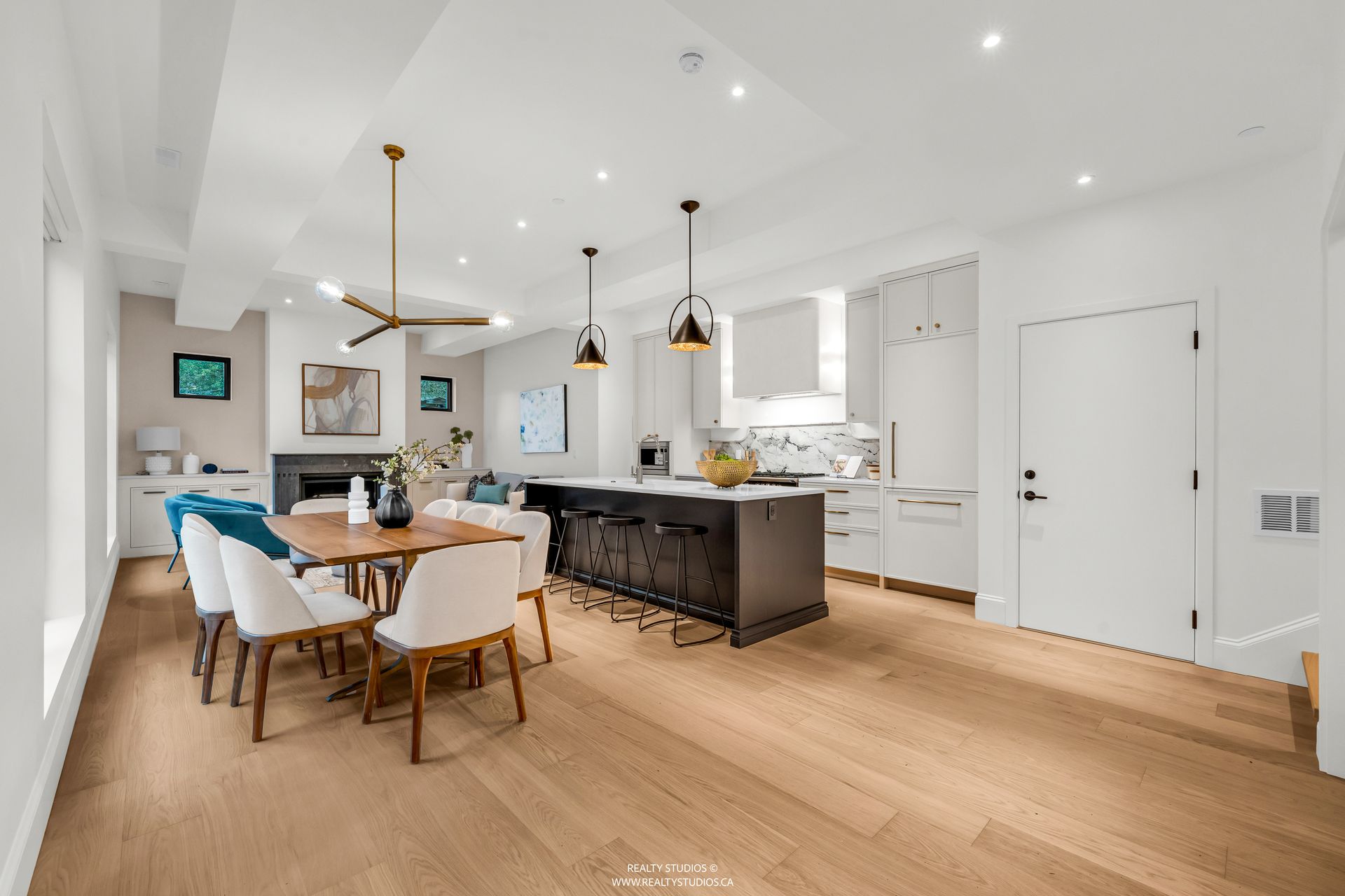 - Open layout living, dining, kitchen and powder room on main