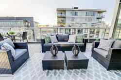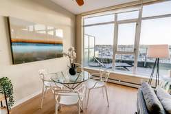 Olympic Village two bedroom + office/ solarium, two bath Sub Penthouse in Wall Centre II has City, Water and Mountain Views and over 600 sq. ft of deck space with gas and water hook up. Very bright open plan with imported Russian hardwood floors, gas range, in suite storage, one parking and two side by side storage lockers. Pets and Rentals OK. This home has one of the largest decks in the area and is truly a great alternative to a detached house.