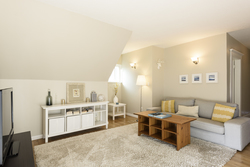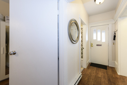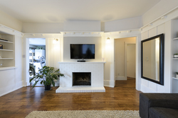 - Character and charm retained in living room with original fireplace, wainscotting wood work