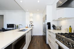 - Polished white quartz counter tops and white undermount Kohler porcelain sink