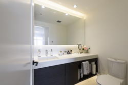 - Integrated linear lighting above and below floating mirror, and under cabinets